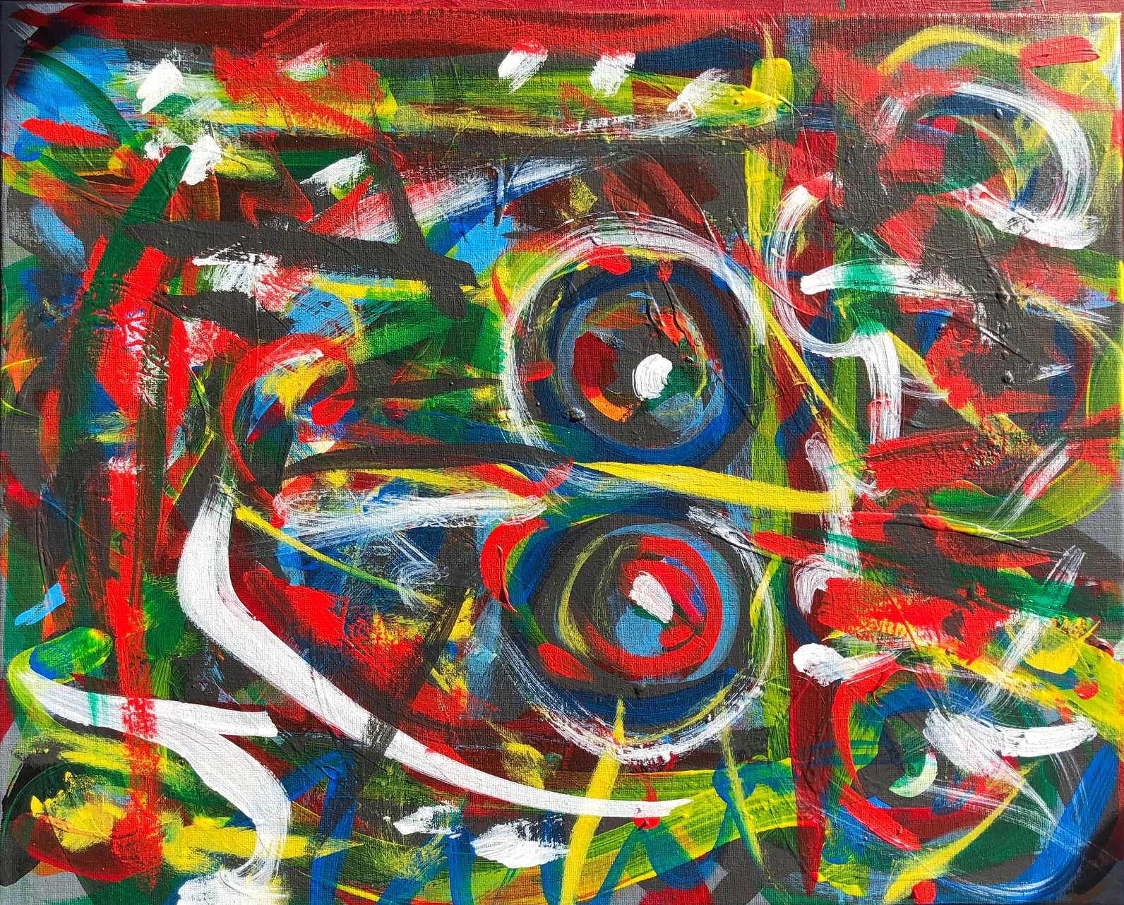 No. 2366. “Going Home Series: Angels in Transition 3″ Available $1,500. Mixed Acrylic on 16″ x 20″ x .5” Stretched Canvas. Artist influences: Joan Miro and Karel Appel. San Diego 2018 | Artist Signature, Year and Piece Number on Back of Canvas. Placement: Canvas may be rotated for flexibility in display and for viewers’ additional experiences.
