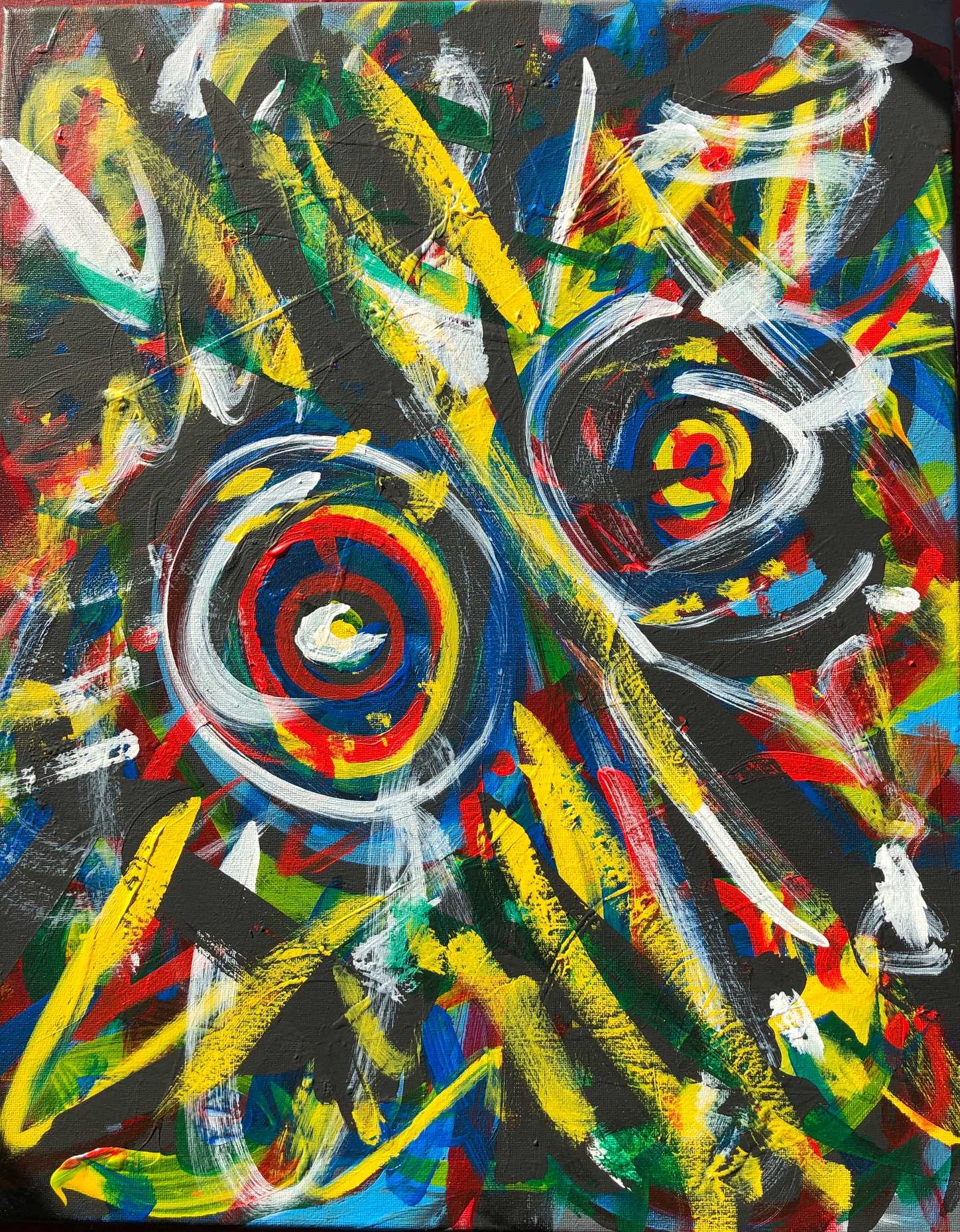 No. 2367. “Going Home Series: Angels in Transition 4″ Available $1,500. Mixed Acrylic on 16″ x 20″ x .5” Stretched Canvas. Artist influences: Joan Miro and Karel Appel. San Diego 2018 | Artist Signature, Year and Piece Number on Back of Canvas. Placement: Canvas may be rotated for flexibility in display and for viewers’ additional experiences.