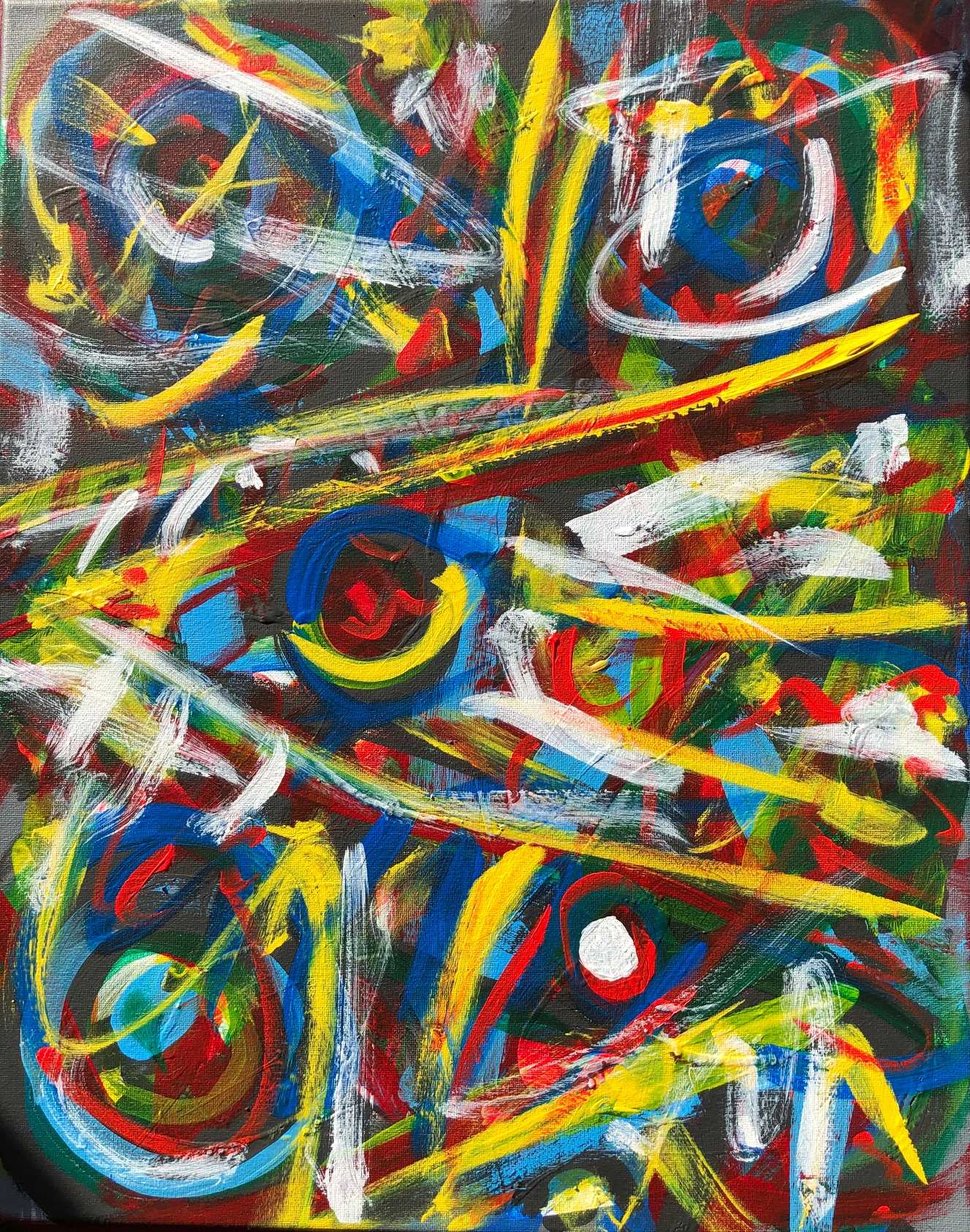 No. 2368. “Going Home Series: Angels in Transition 5″ Available $1,500. Mixed Acrylic on 16″ x 20″ x .5” Stretched Canvas. Artist influences: Joan Miro and Karel Appel. San Diego 2018 | Artist Signature, Year and Piece Number on Back of Canvas. Placement: Canvas may be rotated for flexibility in display and for viewers’ additional experiences.