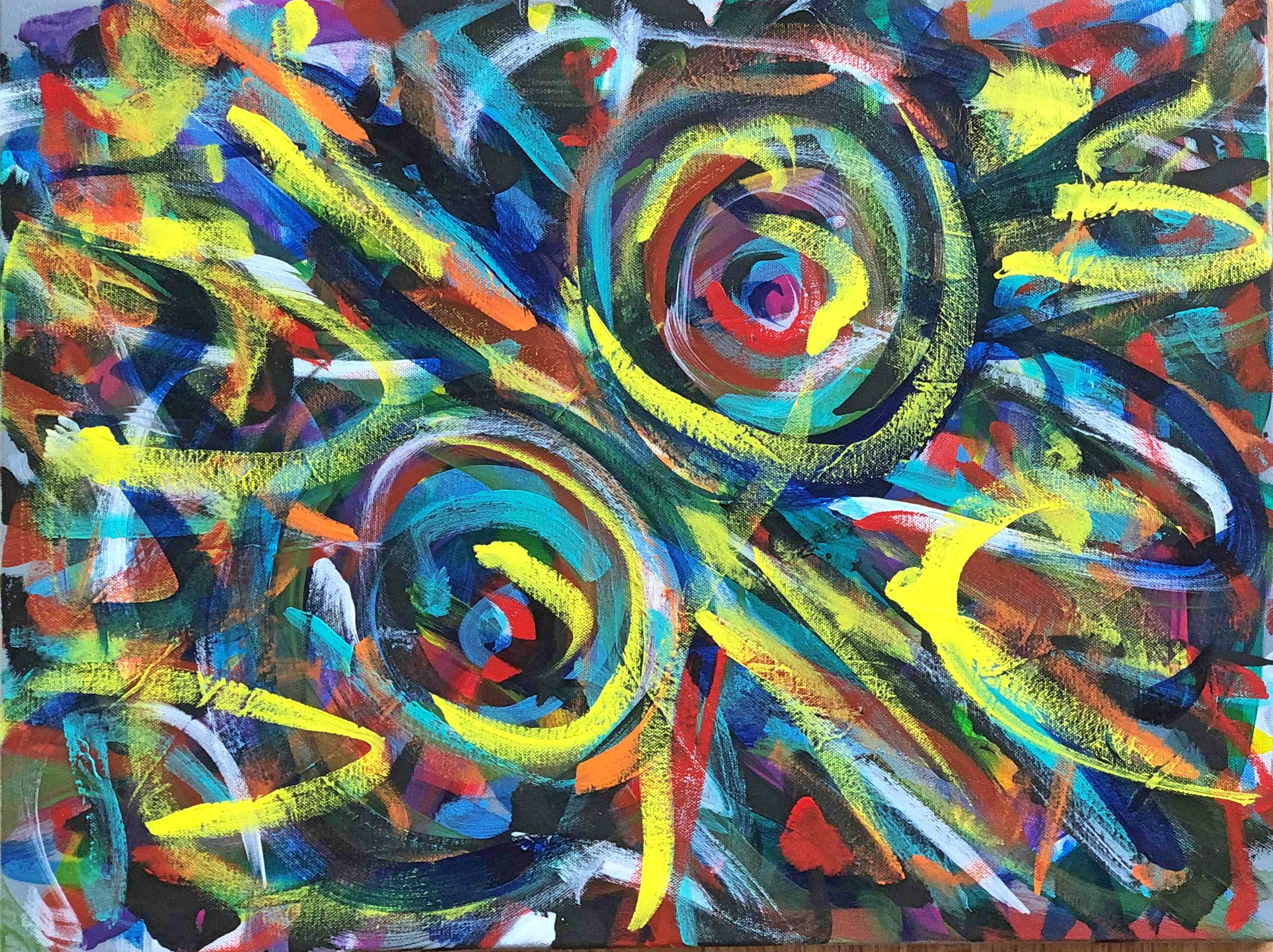 No. 2369. From the artist’s Going Home Series: “Shimmering Angels 1″ Available $2,250. Mixed Acrylic Painting on Quality 18″ x 24″ x 1.5” Stretched Canvas. Artist influences: Joan Miro and Karel Appel. San Diego 2018 | Artist Signature, Year and Piece Number on Back of Canvas. Placement: Canvas may be rotated for flexibility in display and for viewers’ additional experiences.