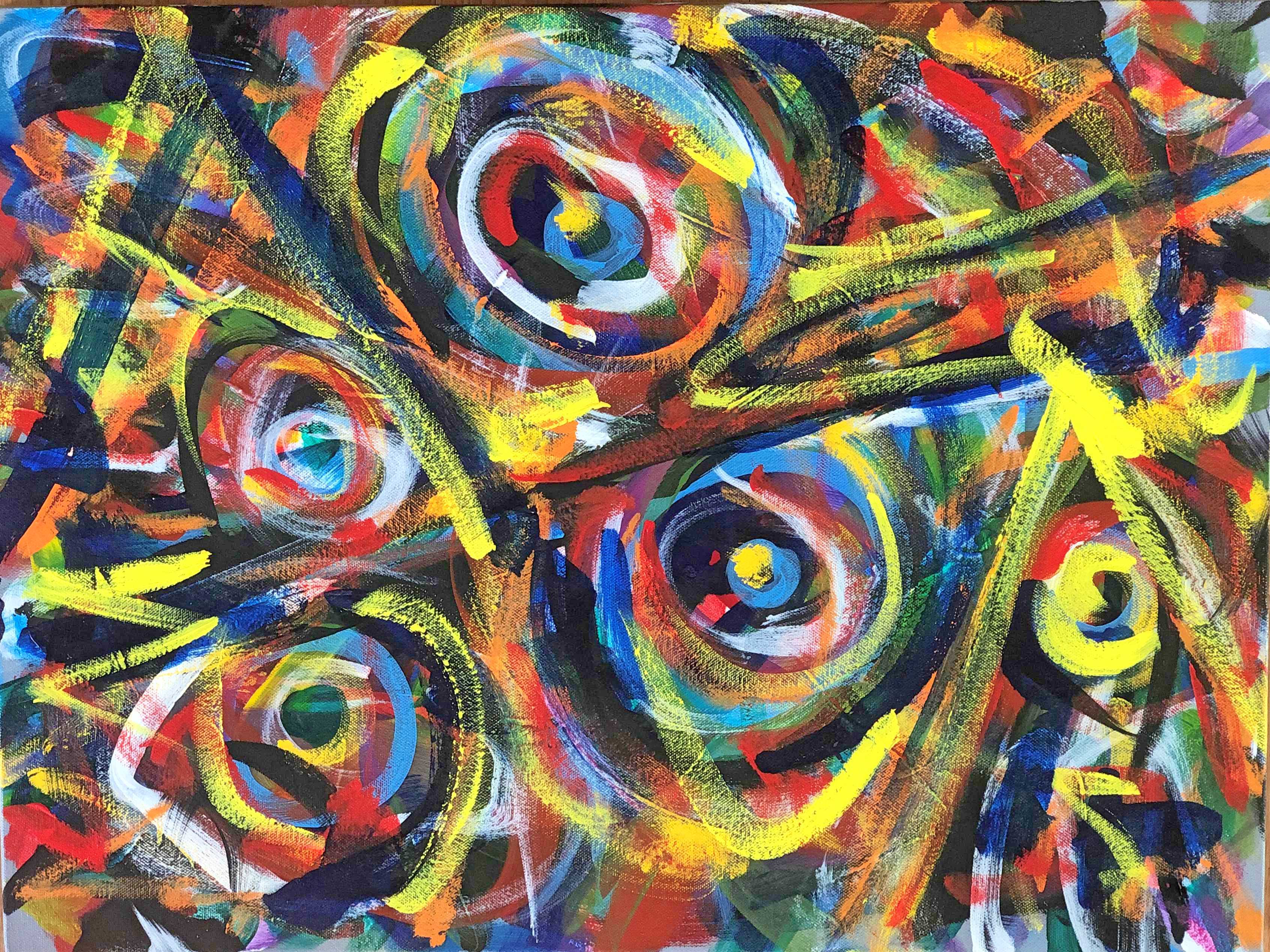 No. 2370. From the artist’s Going Home Series: “Shimmering Angels 2″ (View B) Available $2,250. Mixed Acrylic Painting on Quality 18″ x 24″ x 1.5” Stretched Canvas. Artist influences: Joan Miro and Karel Appel. San Diego 2018 | Artist Signature, Year and Piece Number on Back of Canvas. Placement: Canvas may be rotated for flexibility in display and for viewers’ additional experiences.