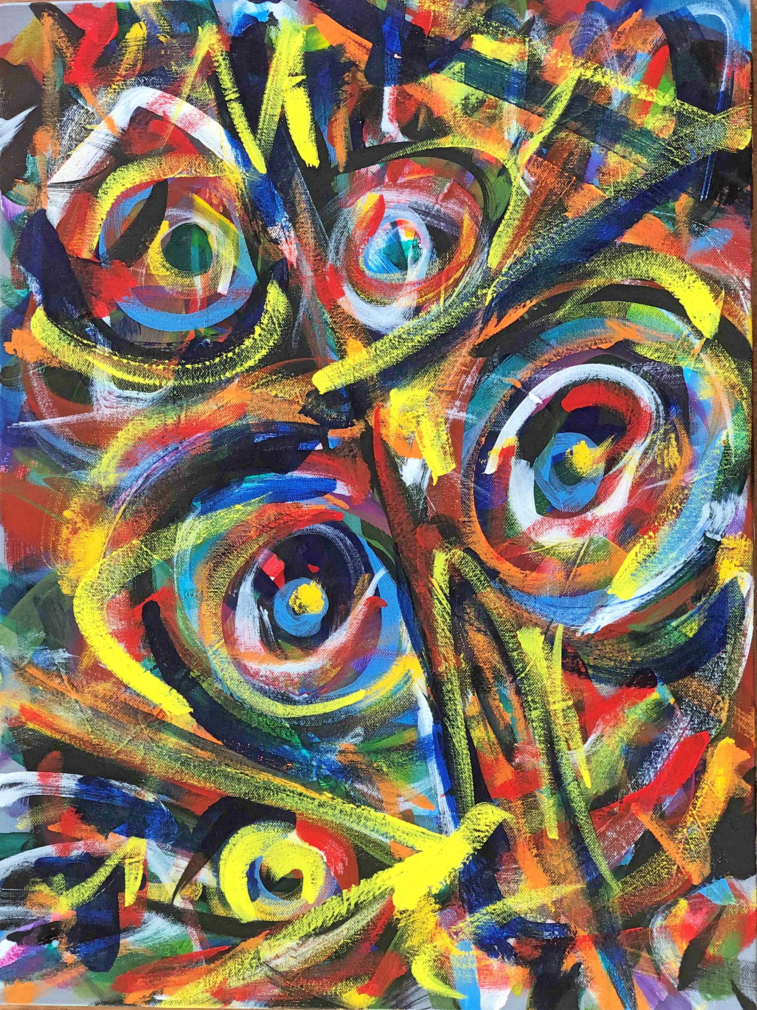 No. 2370. From the artist’s Going Home Series: “Shimmering Angels 2″ Available $2,250. Mixed Acrylic Painting on Quality 18″ x 24″ x 1.5” Stretched Canvas. Artist influences: Joan Miro and Karel Appel. San Diego 2018 | Artist Signature, Year and Piece Number on Back of Canvas. Placement: Canvas may be rotated for flexibility in display and for viewers’ additional experiences.