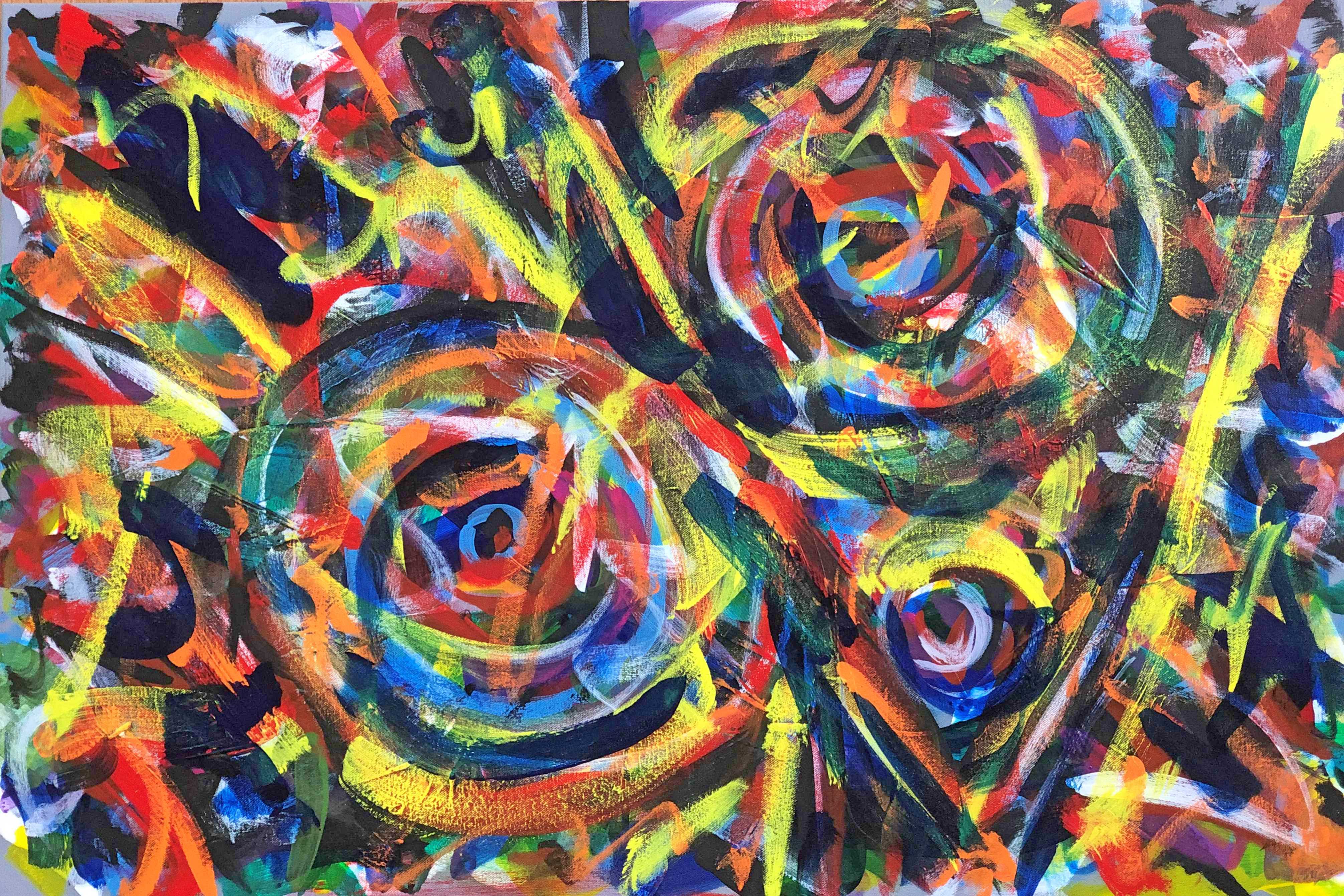 No. 2371. From the artist’s Going Home Series: “Shimmering Angels 3″ Available $3,000. Mixed Acrylic Painting on Quality 24″ x 36″ x 1.5” Stretched Canvas. Artist influences: Joan Miro and Karel Appel. San Diego 2018 | Artist Signature, Year and Piece Number on Back of Canvas. Placement: Canvas may be rotated for flexibility in display and for viewers’ additional experiences.