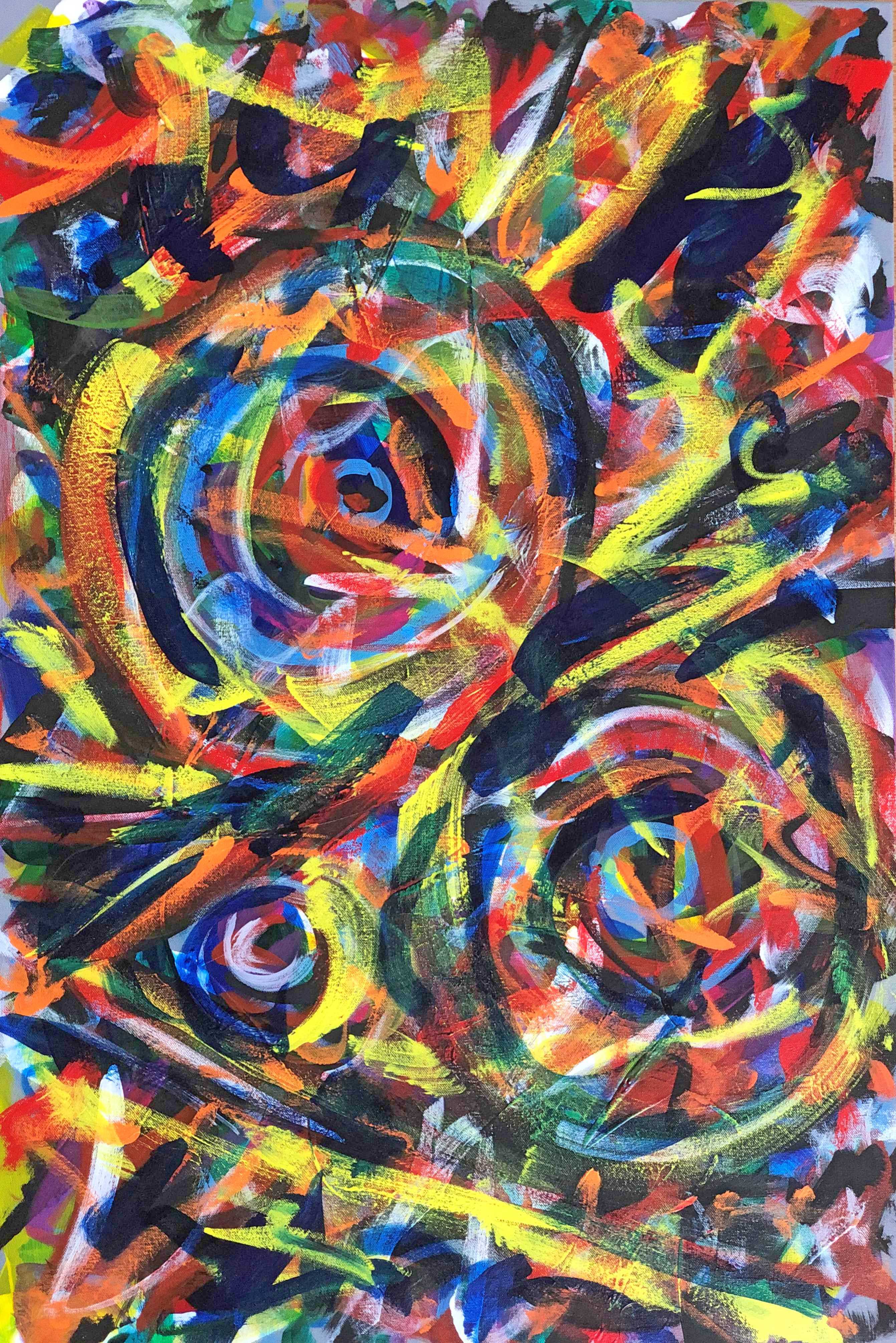 No. 2371. From the artist’s Going Home Series: “Shimmering Angels 3″ Available $3,000. Mixed Acrylic Painting on Quality 24″ x 36″ x 1.5” Stretched Canvas. Artist influences: Joan Miro and Karel Appel. San Diego 2018 | Artist Signature, Year and Piece Number on Back of Canvas. Placement: Canvas may be rotated for flexibility in display and for viewers’ additional experiences.