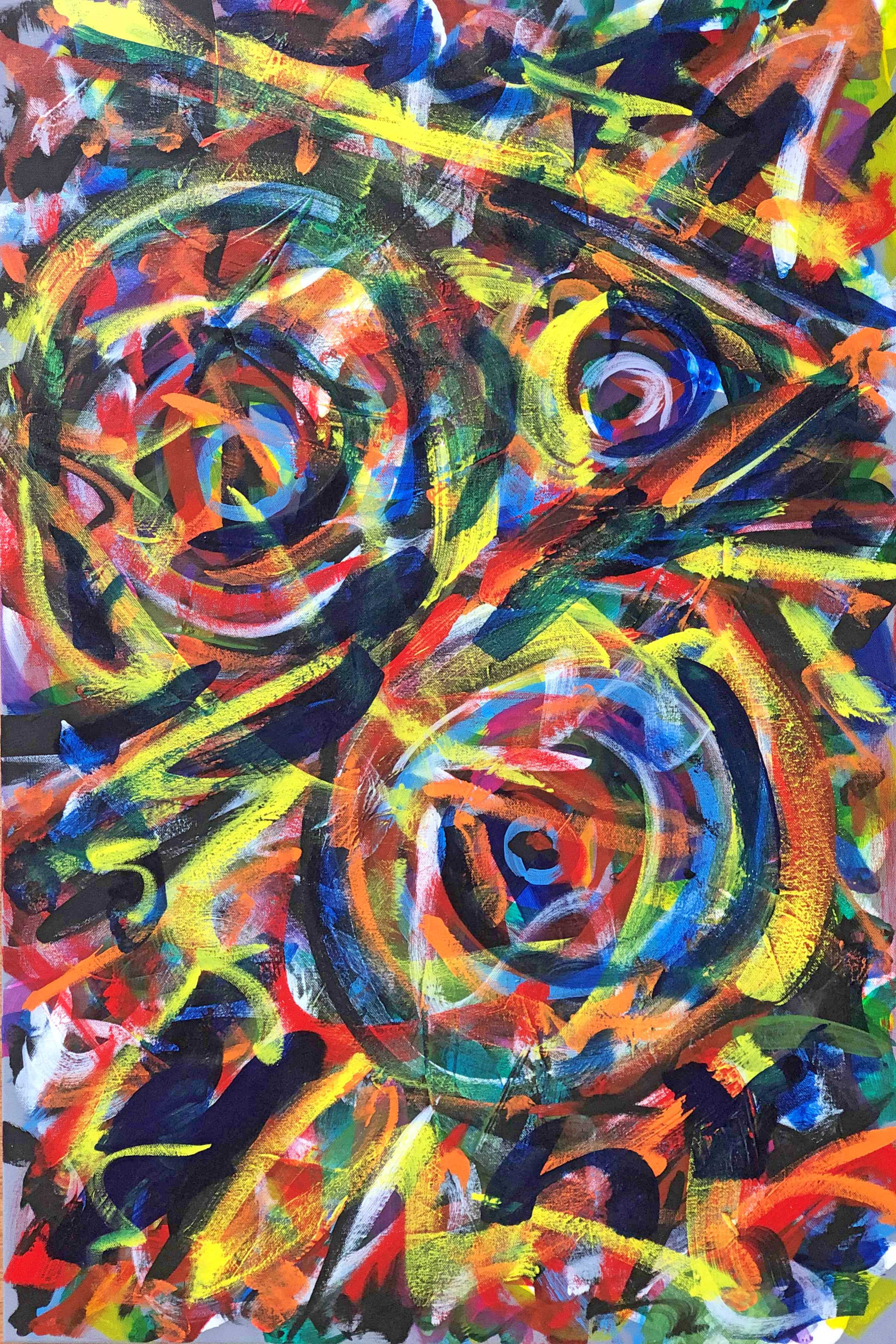 No. 2371. From the artist’s Going Home Series: “Shimmering Angels 3″ Available $3,000. Mixed Acrylic Painting on Quality 24″ x 36″ x 1.5” Stretched Canvas. Artist influences: Joan Miro and Karel Appel. San Diego 2018 | Artist Signature, Year and Piece Number on Back of Canvas. Placement: Canvas may be rotated for flexibility in display and for viewers’ additional experiences.