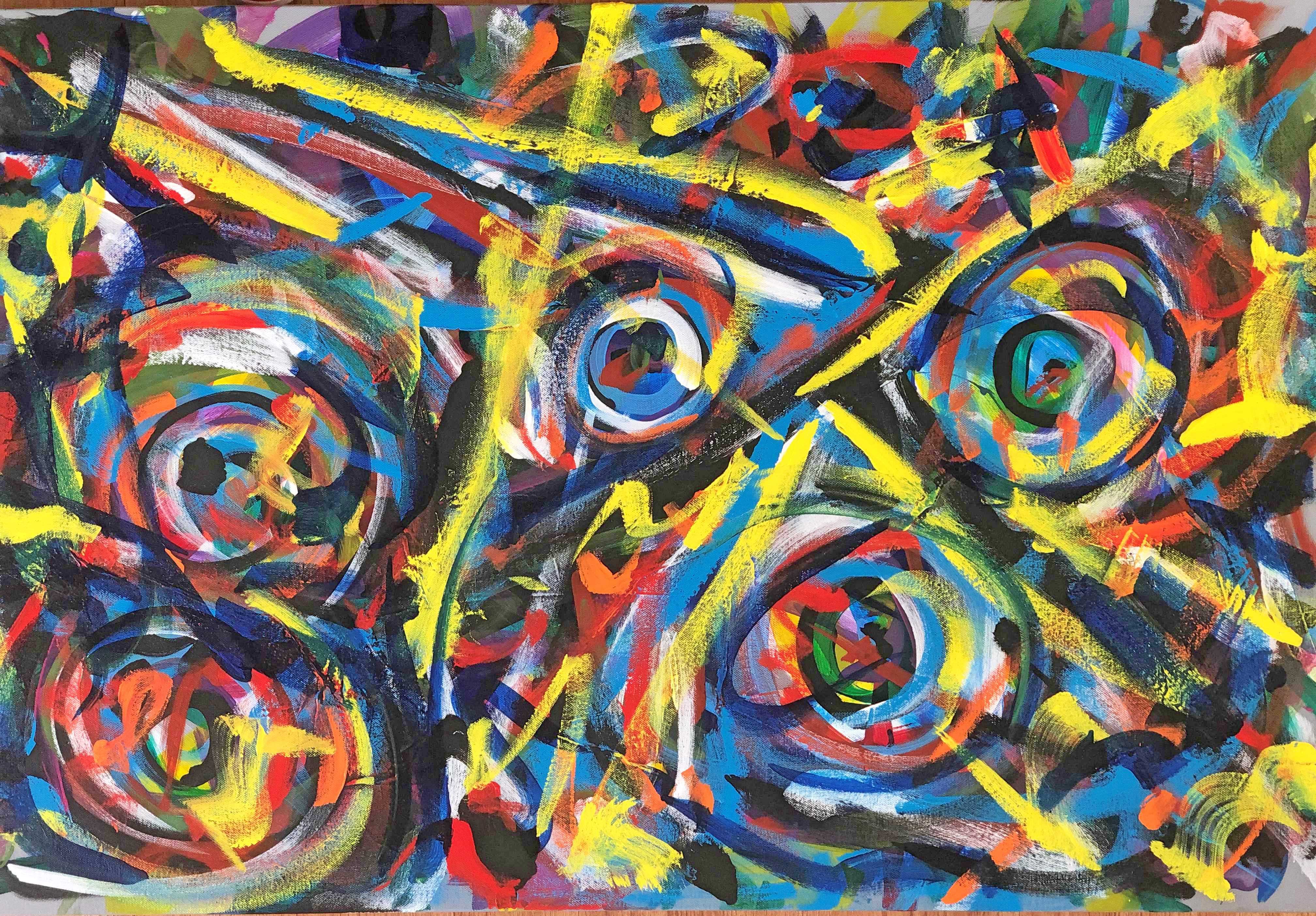 No. 2371. From the artist’s Going Home Series: “Shimmering Angels 4″ (View A) Available $3,000. Mixed Acrylic Painting on Quality 24″ x 36″ x 1.5” Stretched Canvas. Artist influences: Joan Miro and Karel Appel. San Diego 2018 | Artist Signature, Year and Piece Number on Back of Canvas. Placement: Canvas may be rotated for flexibility in display and for viewers’ additional experiences.