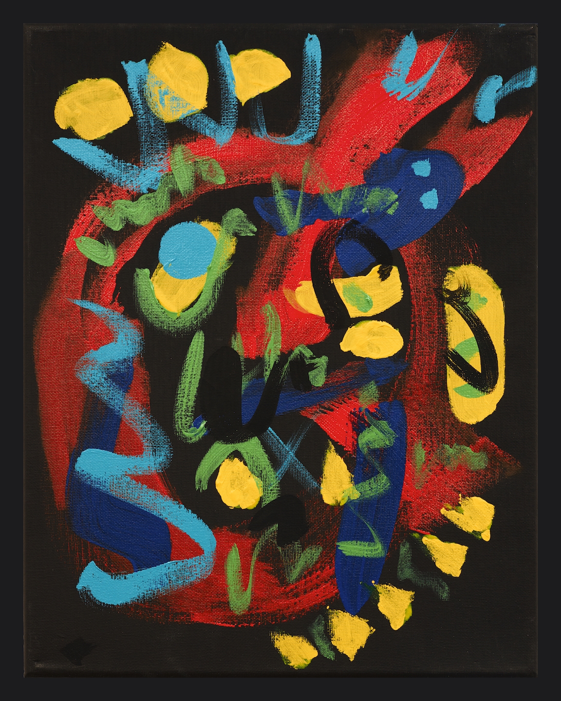 Original mixed acrylic paint on 14″h x 11″w x 0.5″ stretched canvas. Artist number, signature and date en verso. May be viewed from each of 4 sides for view enjoyment.