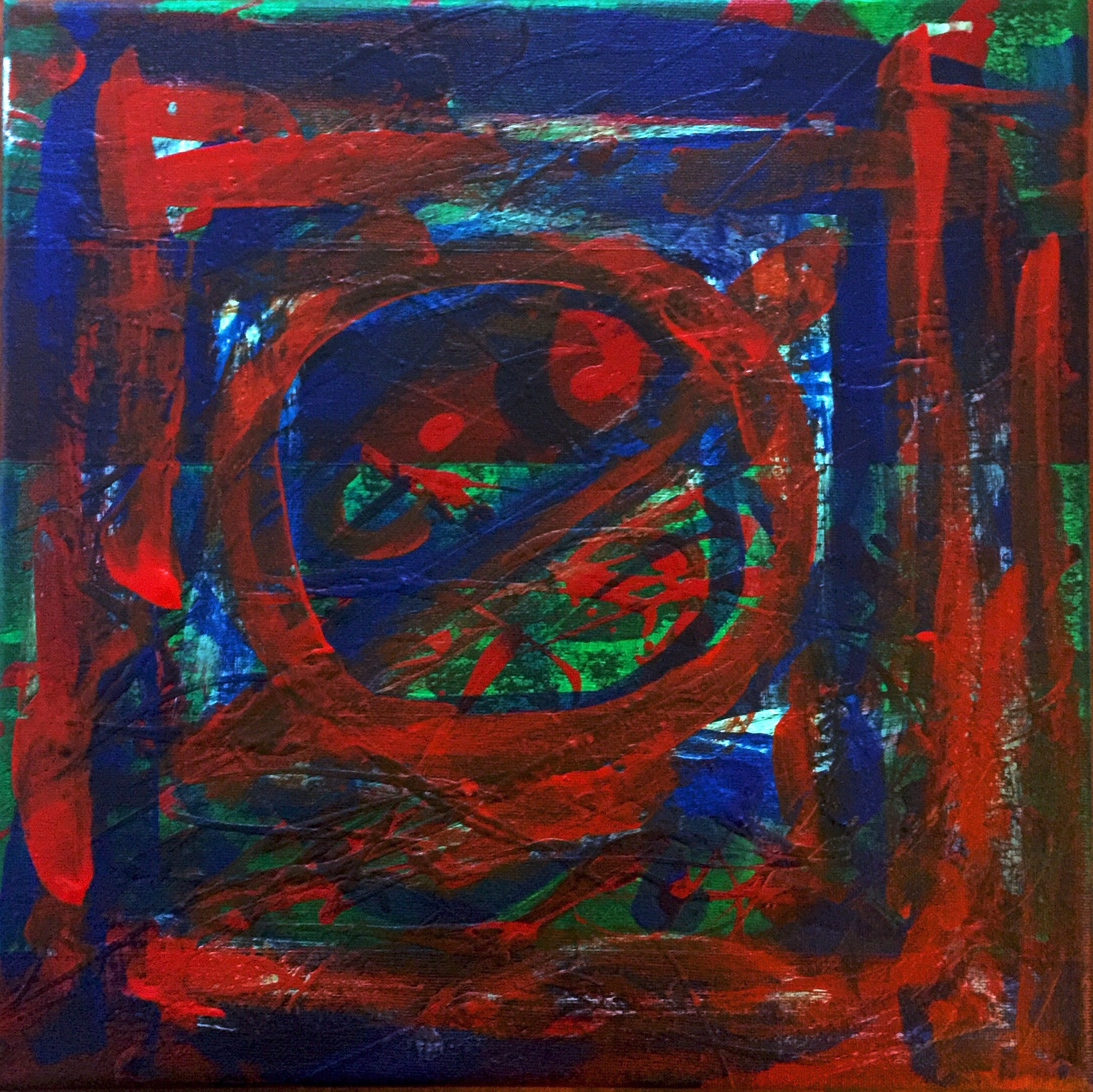 No. 2330. “Window Pane Green & Cinnamon” from the Kaleidoscopic Illusion Series. $200. Original mixed acrylic paint on 12″ x 12″ x .5″ stretched canvas. © 2016 John R Kazanjian, San Diego, CA. Artist influences: Frank Stella, Wassily Kandinsky, Paul Klee, Karel Appel, Picasso, Joan Miro, Sam Francis, Bauhaus Arts and Textiles. Artist signature, Year and Piece Number on back of canvas. Placement: canvas may be rotated for flexibility in display and for viewers’ additional experiences.