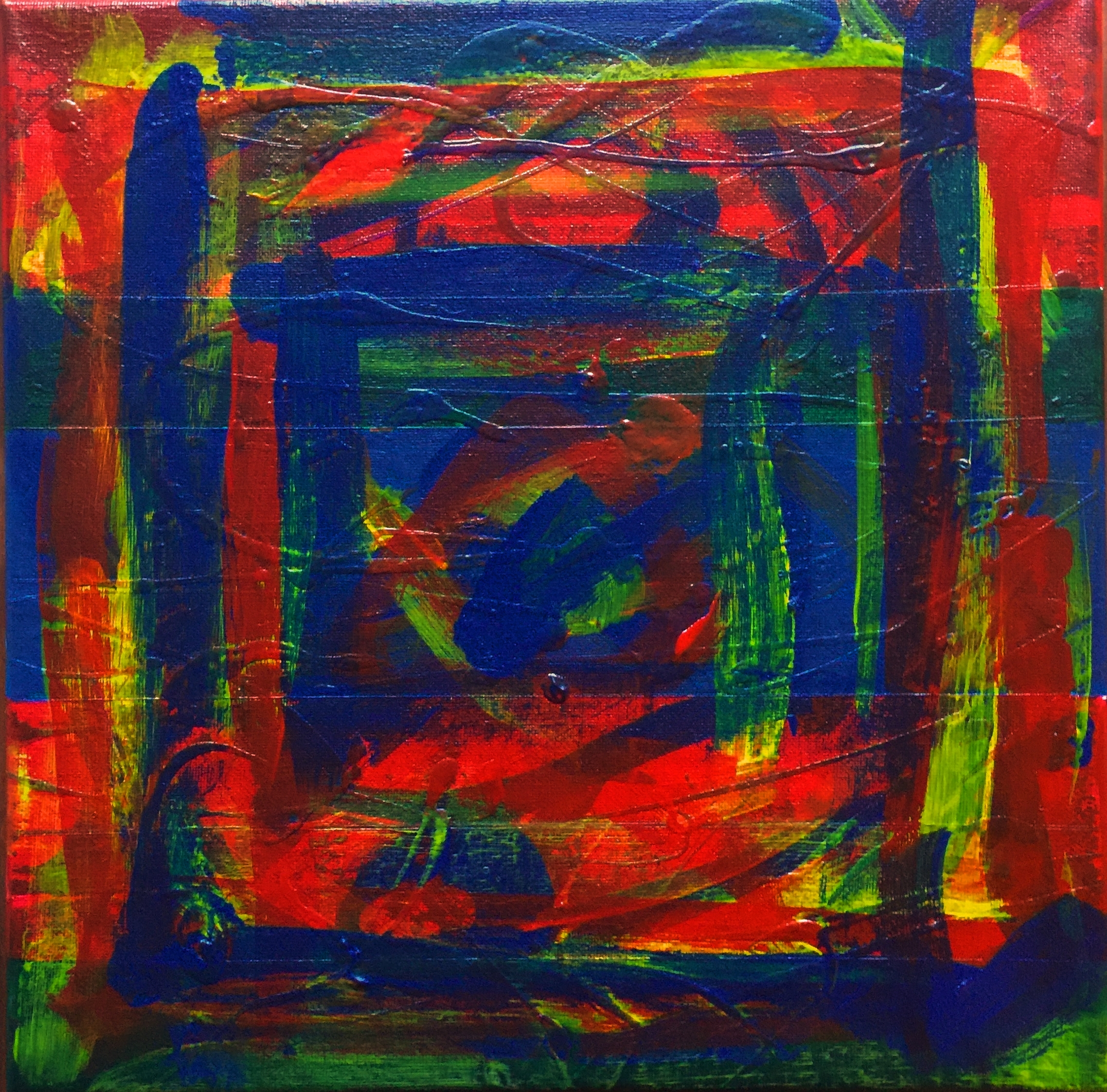 No. 2331. “Window Pane Green, Blue & Red” from the Kaleidoscopic Illusion Series. $200. Original mixed acrylic paint on 12″ x 12″ x .5″ stretched canvas. © 2016 John R Kazanjian, San Diego, CA. Artist influences: Frank Stella, Wassily Kandinsky, Paul Klee, Karel Appel, Picasso, Joan Miro, Sam Francis, Bauhaus Arts and Textiles. Artist signature, Year and Piece Number on back of canvas. Placement: canvas may be rotated for flexibility in display and for viewers’ additional experiences.