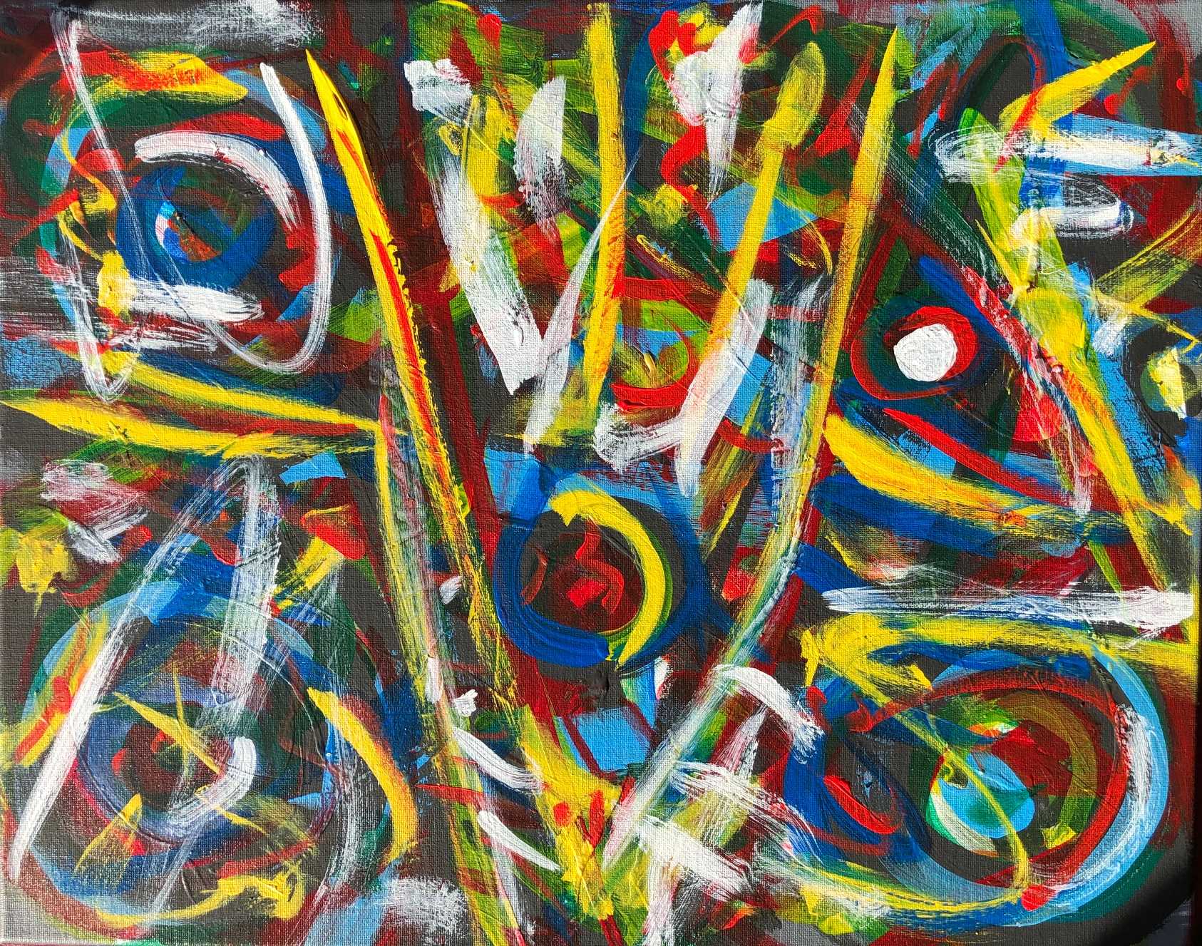 No. 2368. “Going Home Series: Angels in Transition 5″ Available $1,500. Mixed Acrylic on 16″ x 20″ x .5” Stretched Canvas. Artist influences: Joan Miro and Karel Appel. San Diego 2018 | Artist Signature, Year and Piece Number on Back of Canvas. Placement: Canvas may be rotated for flexibility in display and for viewers’ additional experiences.