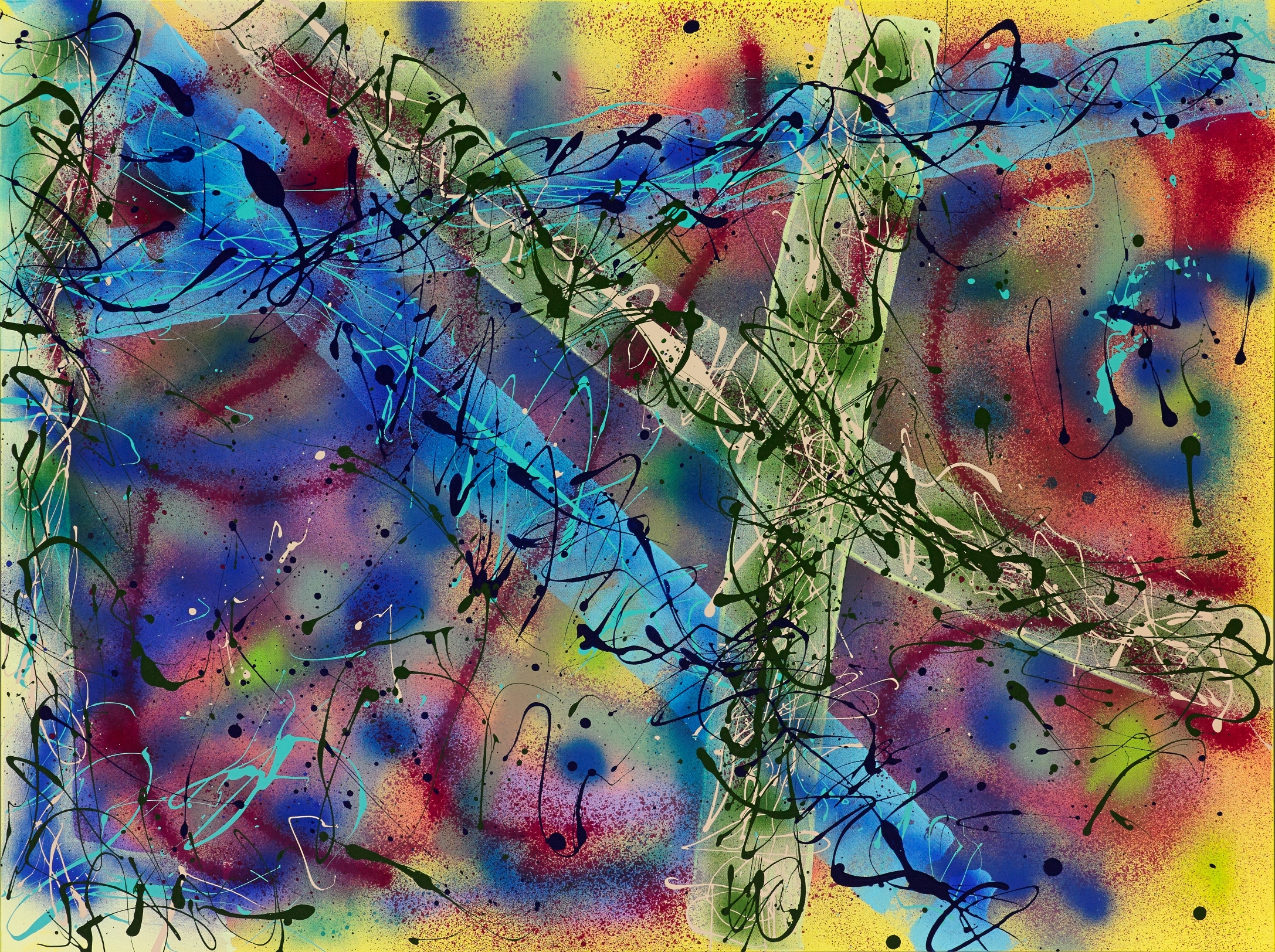 © 2014 John R Kazanjian, Las Vegas, NV. Artist influences: Joan Miro and Alexander Calder. Artist Signature, Year and Piece Number on Back of Canvas. Placement: Diptych Canvases may be paired together horizontally or vertically resulting in displays of 36″H x 96″W or 48″H x 72″W.