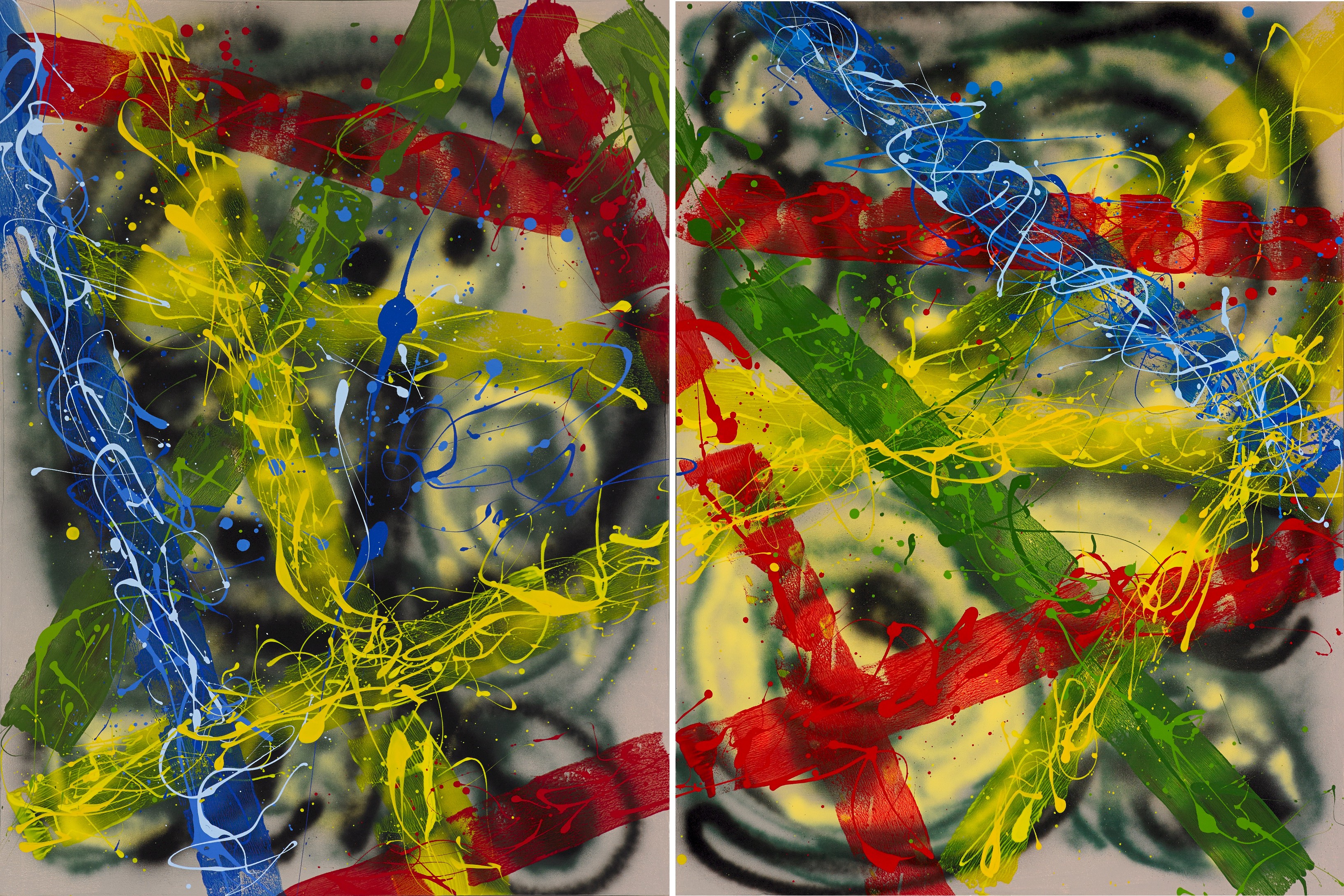 © 2014 John R Kazanjian, Las Vegas, NV. Artist influences: Joan Miro and Alexander Calder. Artist Signature, Year and Piece Number on Back of Canvas. Placement: Diptych Canvases may be paired together horizontally or vertically resulting in displays of 36″H x 96″W or 48″H x 72″W.