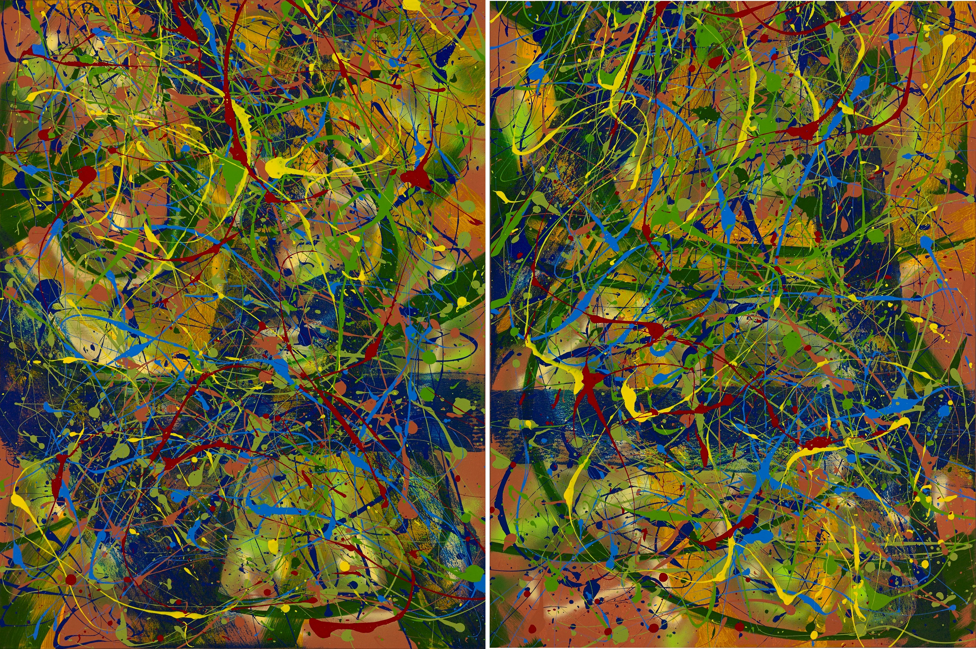 © 2014 John R Kazanjian, Las Vegas, NV. Artist influences: Joan Miro, Sam Francis and Jackson Pollack. Artist Signature, Year and Piece Number on Back of Canvas. Placement: Diptych Canvases may be paired together horizontally or vertically resulting in displays of 36″H x 96″W or 48″H x 72″W.