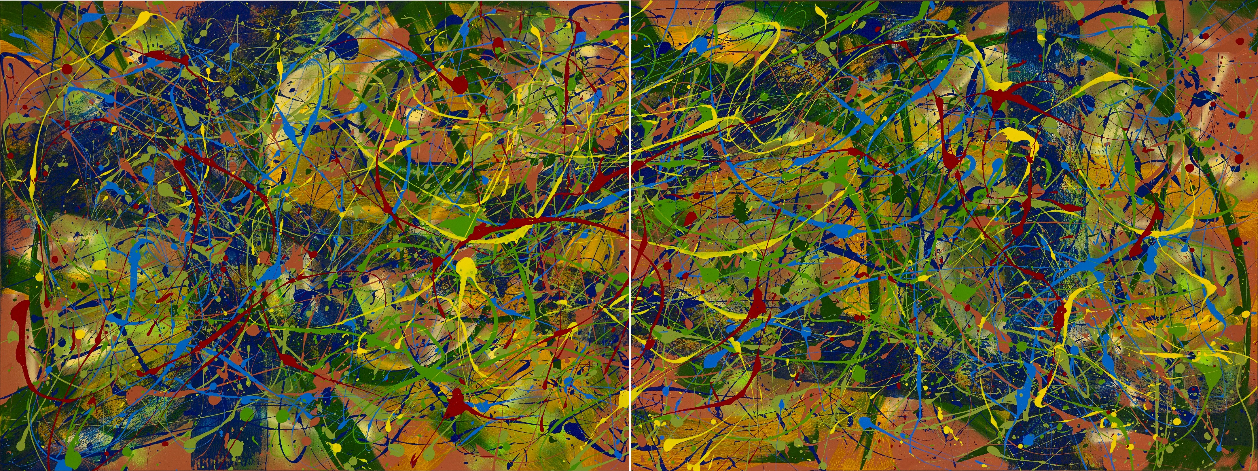 Diptych – Panels 1 and 2. © 2014 John R Kazanjian, Las Vegas, NV. Artist influences: Joan Miro, Sam Francis and Jackson Pollack. Artist Signature, Year and Piece Number on Back of Canvas. Placement: Diptych Canvases may be paired together horizontally or vertically resulting in displays of 36″H x 96″W or 60″H x 72″W.