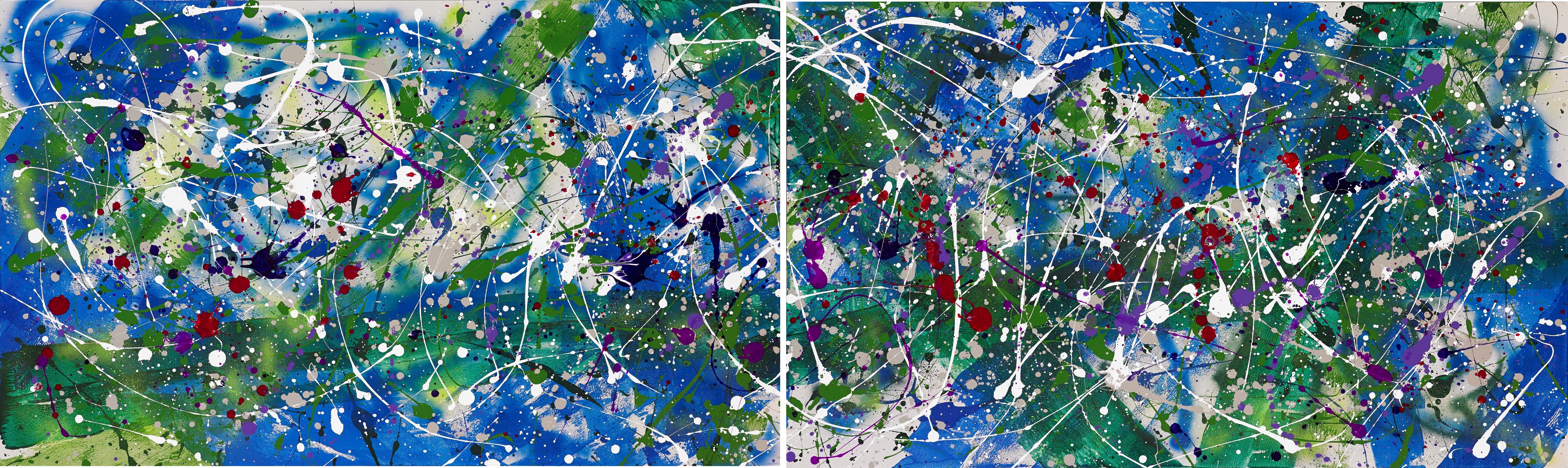 © 2014 John R Kazanjian, Las Vegas, NV. Artist influences: Joan Miro, Sam Francis and Jackson Pollack. Diptych – Panels 1 and 2. Artist Signature, Year and Piece Number on Back of Canvas. Placement: Diptych Canvases may be paired together horizontally or vertically resulting in displays of 36″H x 120″W or 60″H x 72″W.