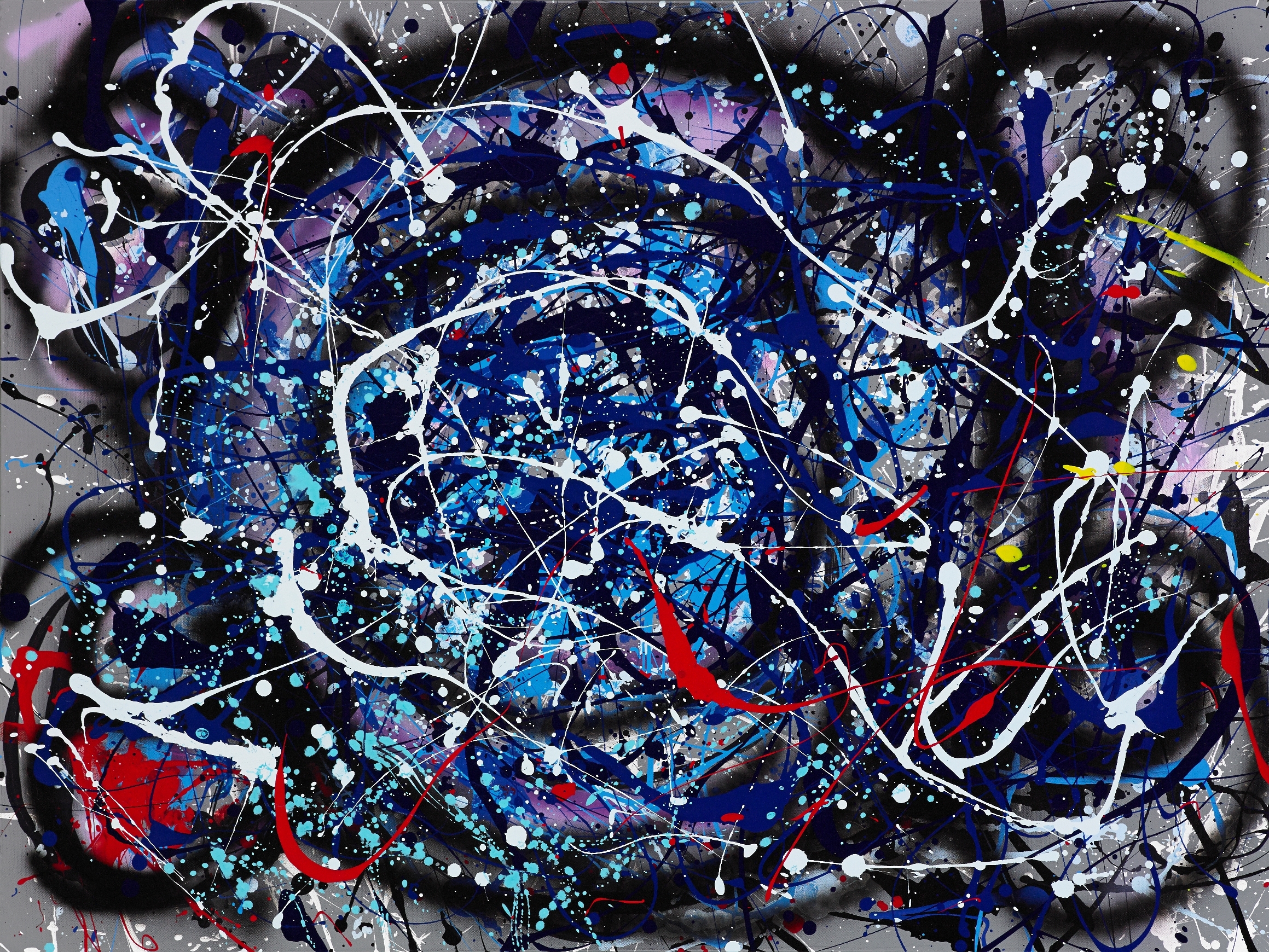 No. 2249. Ode to Miro Series: “Universal Time Traveler” $2,950. Original Mixed Acrylic on 30″h x 40″w x 1.5″ Stretched Canvas. 2014 John R Kazanjian, Las Vegas, NV. Tribute to Miro’s “Les Geants” series from the time when Miro collaborated with Jackson Pollack in the early 1960’s.Artist Signature, Year and Piece Number on Back of Canvas. Placement: Canvas may be rotated for flexibility in display and for viewers’ additional experiences.