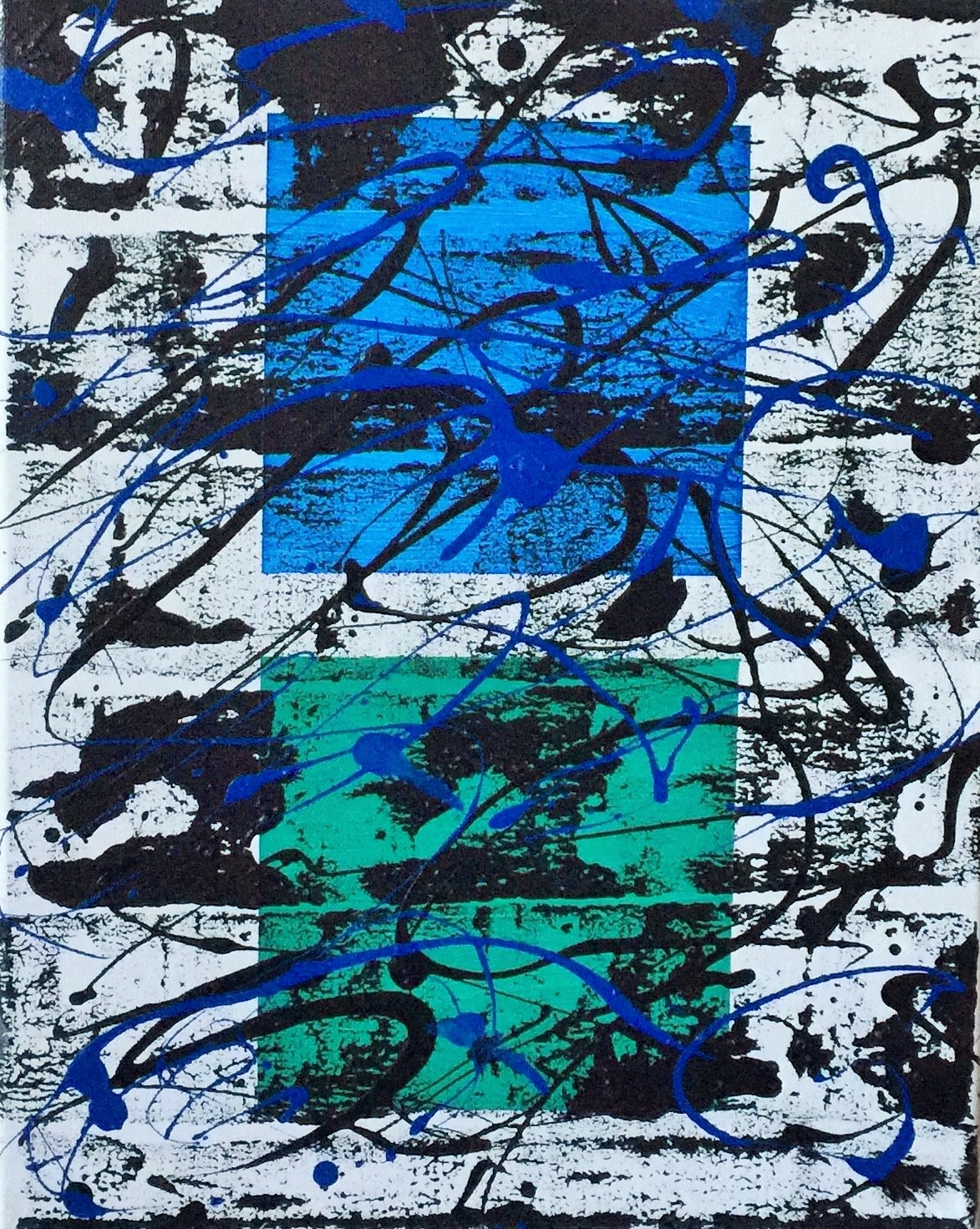 No. 2337. Film Strip Series: “Etude Blue and Teal”. $175. Original Mixed Acrylic on stretched canvas 11″ x 14″ x .33″.