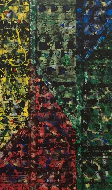 No. 2320. Film Strip Series: “Neighboring Opinions”. $4,500. Original Mixed Acrylic on stretched canvas 36″ x 60″ x 1.5″.