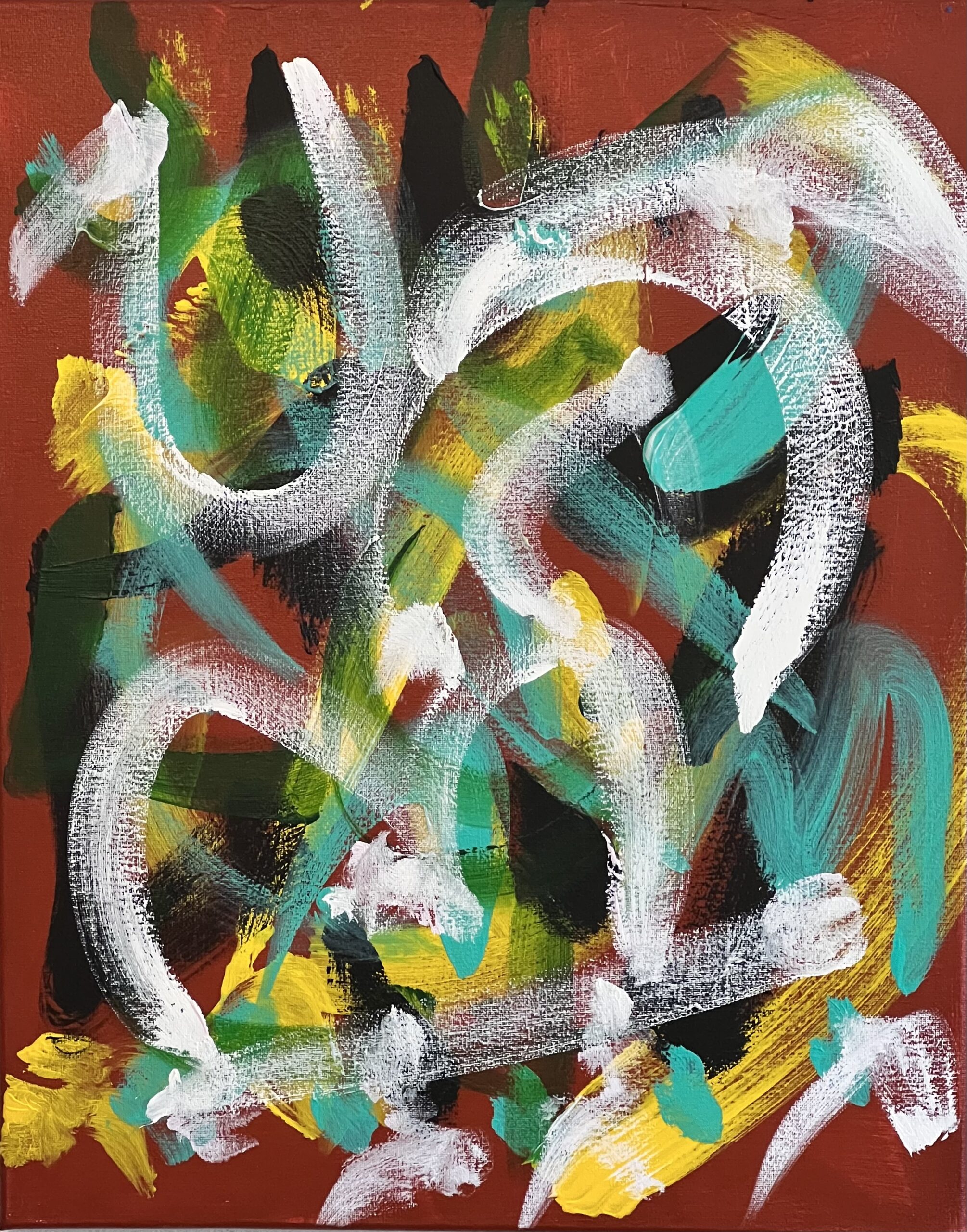 Original mixed acrylic paint on 20″h x 16″w x 0.5″ stretched canvas. Artist number, signature and date en verso. May be viewed from each of 4 sides for view enjoyment. San Diego 2022.