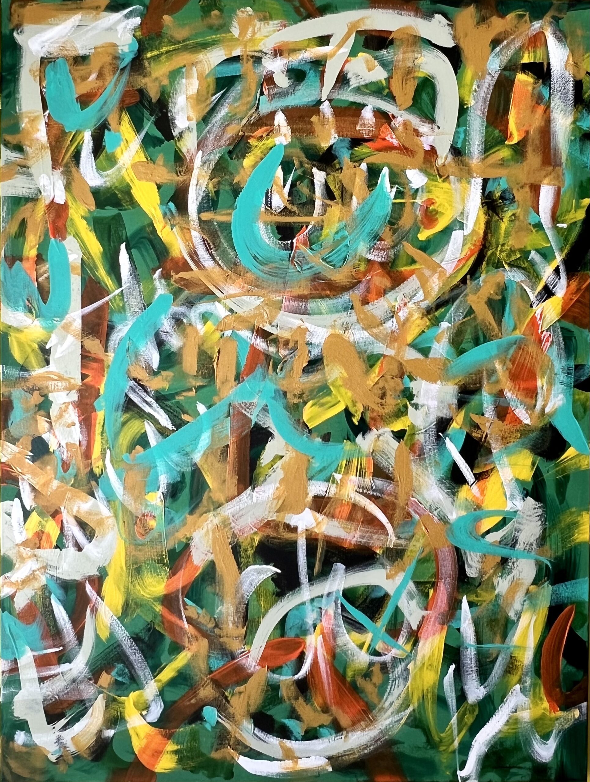 Original mixed acrylic paint on 48″h x 36″w x 0.5″ stretched canvas. Artist number, signature and date en verso. May be viewed from each of 4 sides for view enjoyment. San Diego 2022.