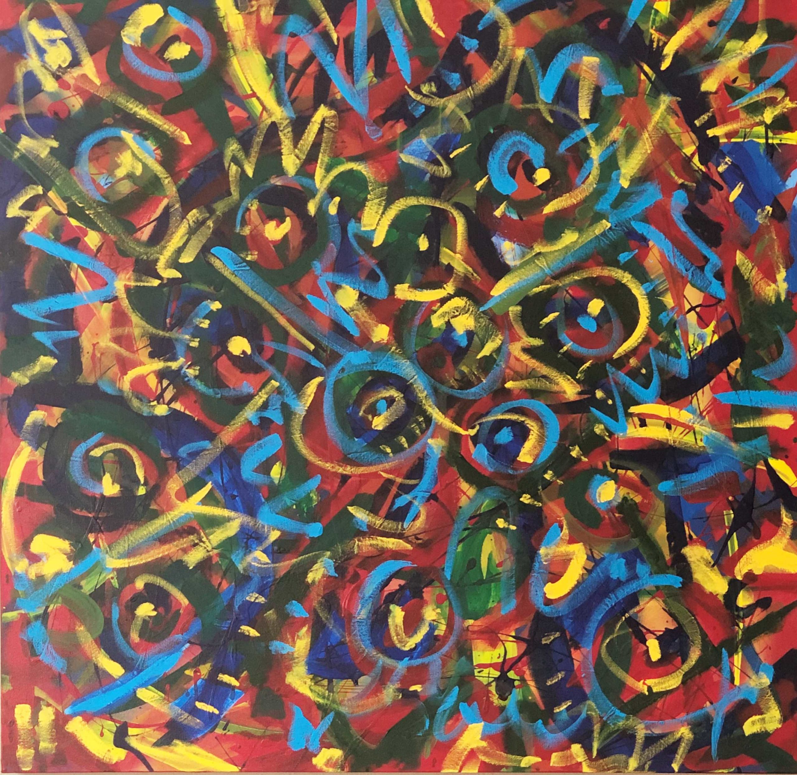 No. 2295. Primitive Series: “Toy Soldiers”. $4,250. Original Mixed Acrylic on 36″h x 36″w Premium Quality Stretched Canvas. © 2014 / Redo Feb 2019 John R Kazanjian, Las Vegas, NV. Artist influences: Joan Miro, Pablo Picasso, San Francis and Bennett Norbo. Artist Signature, Year and Piece Number on Back of Canvas. Placement: Canvas may be rotated for flexibility in display and for viewers’ additional experiences. Artist Signature, Year and Piece Number on Back of Canvas.