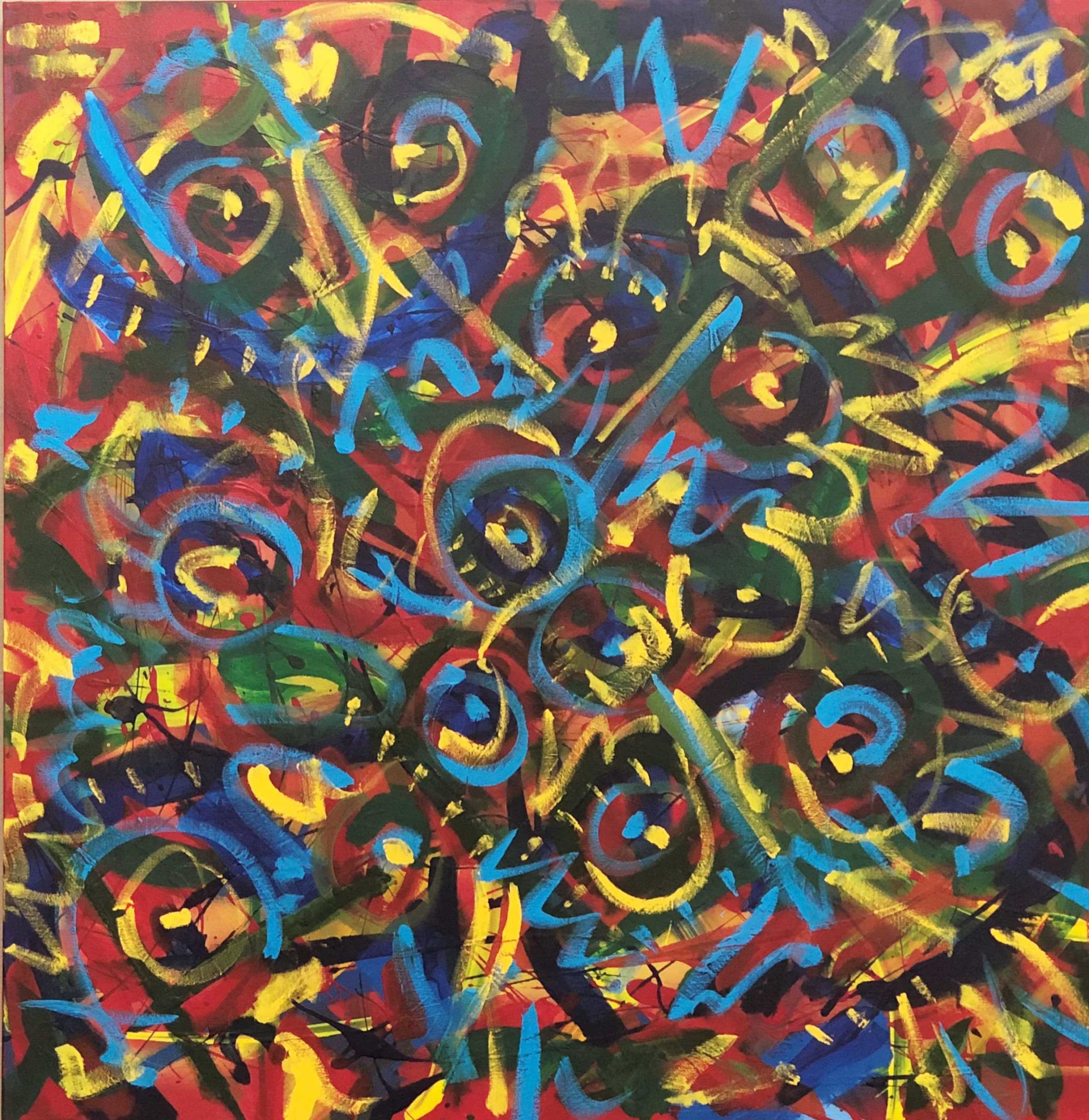 No. 2295. Primitive Series: “Toy Soldier”. $4,250. Original Mixed Acrylic on 36″h x 36″w Premium Quality Stretched Canvas. © 2014 / Redo Feb 2019 John R Kazanjian, Las Vegas, NV. Artist influences: Joan Miro, Pablo Picasso, San Francis and Bennett Norbo. Artist Signature, Year and Piece Number on Back of Canvas. Placement: Canvas may be rotated for flexibility in display and for viewers’ additional experiences.