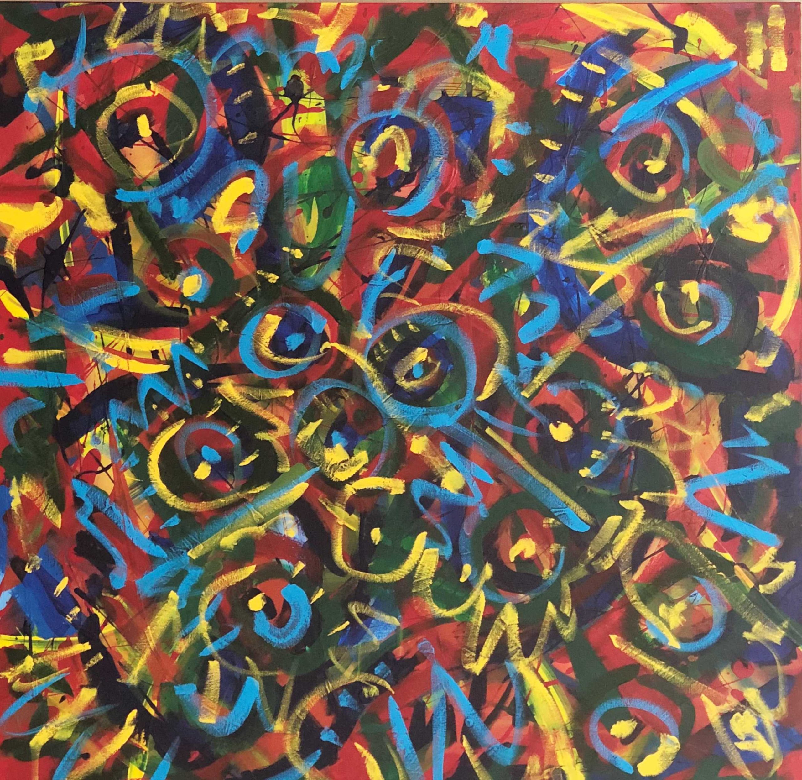 No. 2295. Primitive Series: “Toy Soldiers”. $4,250. Original Mixed Acrylic on 36″h x 36″w Premium Quality Stretched Canvas. © 2014 / Redo Feb 2019 John R Kazanjian, Las Vegas, NV. Artist influences: Joan Miro, Pablo Picasso, San Francis and Bennett Norbo. Artist Signature, Year and Piece Number on Back of Canvas. Placement: Canvas may be rotated for flexibility in display and for viewers’ additional experiences.