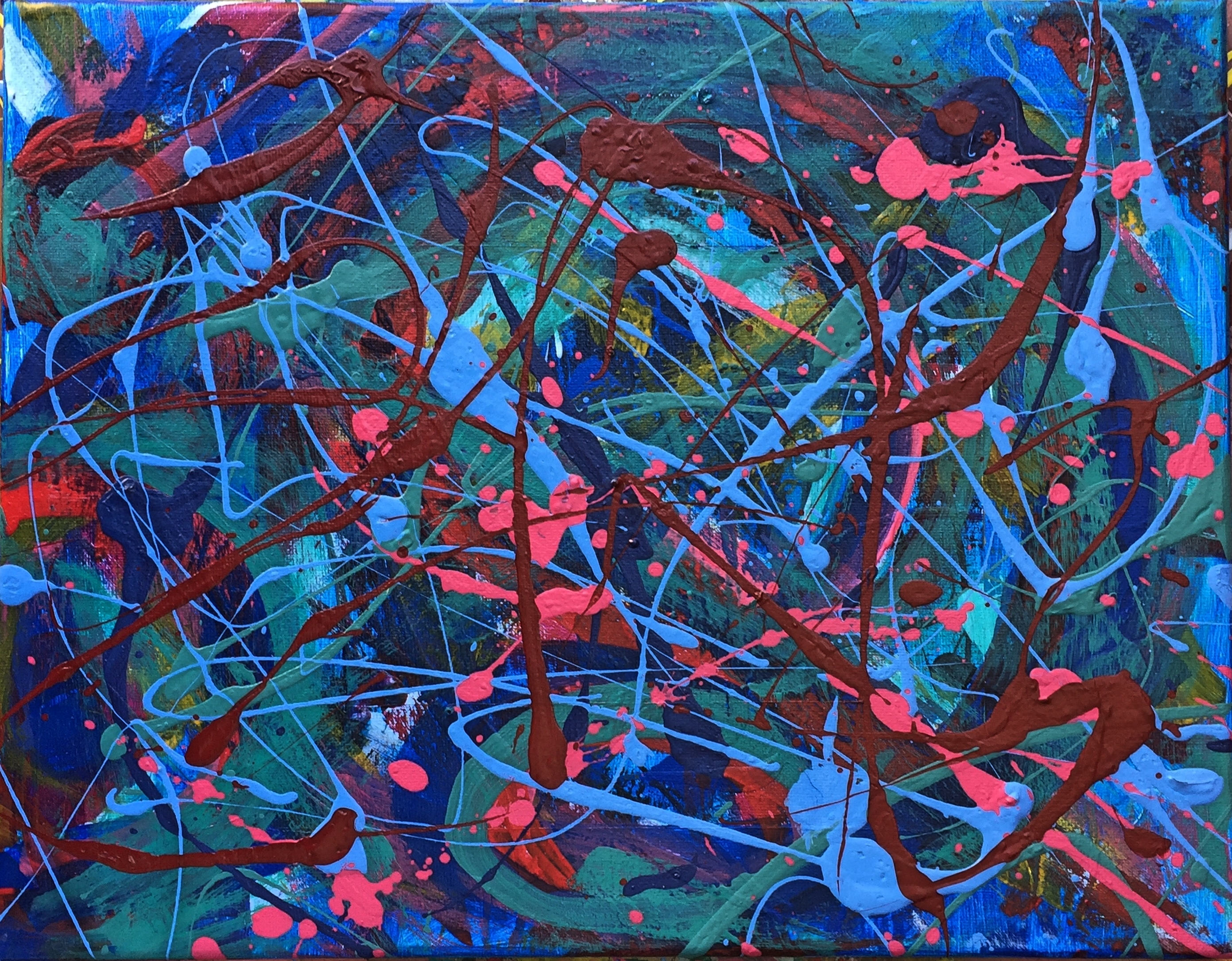 No. 2338. “Etude Blue” from the Wellness Chakra Healing Series. SOLD $225.00. Original mixed acrylic paints on 11″ x 14″ x .33″ stretched canvas. © 2015 John R Kazanjian, San Diego, CA. Artist influences: Karel Appel, Joan Miro, Sam Francis, Bauhaus Arts and Textiles. Artist signature, Year and Piece Number on back of canvas. Placement: canvas may be rotated for flexibility in display and for viewers’ additional experiences.
