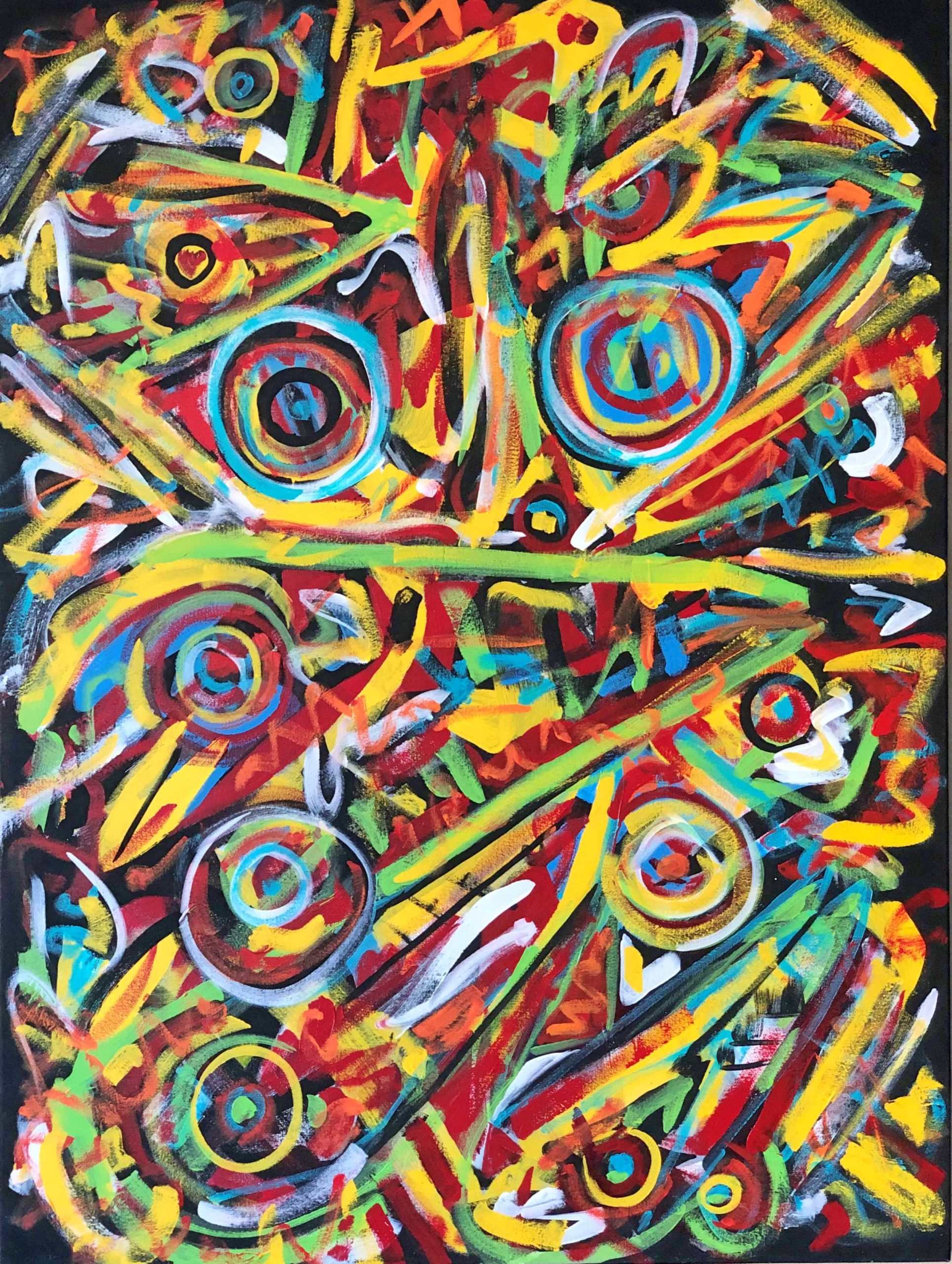 No. 2373. “Celebration Gathering” aka “Murder of Crows” from the Artist’s Primitive Series. $6,500. Original mixed acrylic paint on 48″ x 36″ x 1.5″ stretched canvas. © Dec 2018 John R Kazanjian, San Diego, CA. Artist influences: Joan Miro, Pablo Picasso, San Francis, Karl Appel and Pul Klee. Artist Signature, Year and Piece Number on Back of Canvas. Placement: Canvas may be rotated for flexibility in display and for viewers’ additional experiences.
