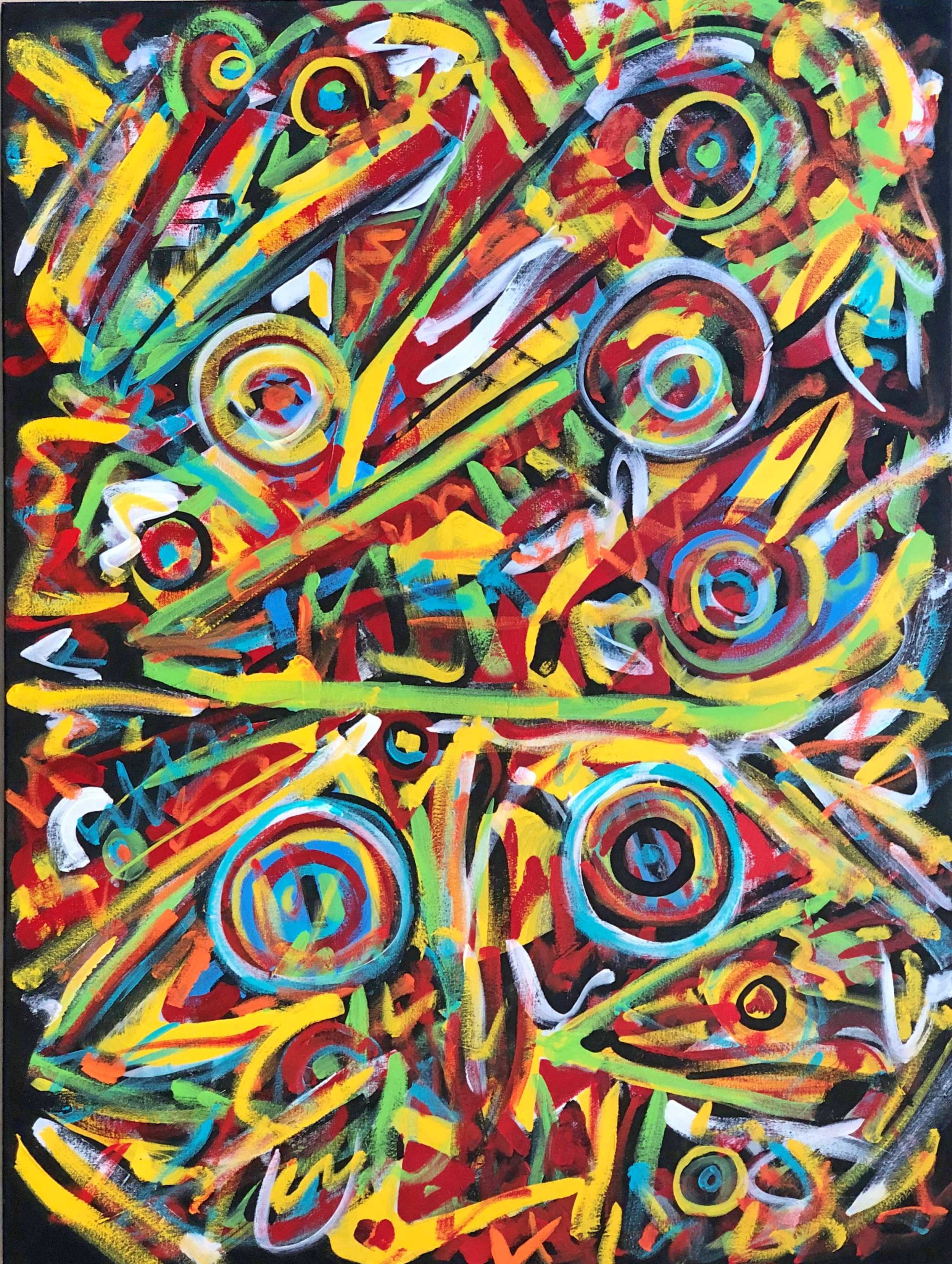 No. 2373. “Celebration Gathering” aka “Murder of Crows” from the Artist’s Primitive Series. $6,500. Original mixed acrylic paint on 48″ x 36″ x 1.5″ stretched canvas. © Dec 2018 John R Kazanjian, San Diego, CA. Artist influences: Joan Miro, Pablo Picasso, San Francis, Karl Appel and Pul Klee. Artist Signature, Year and Piece Number on Back of Canvas. Placement: Canvas may be rotated for flexibility in display and for viewers’ additional experiences.