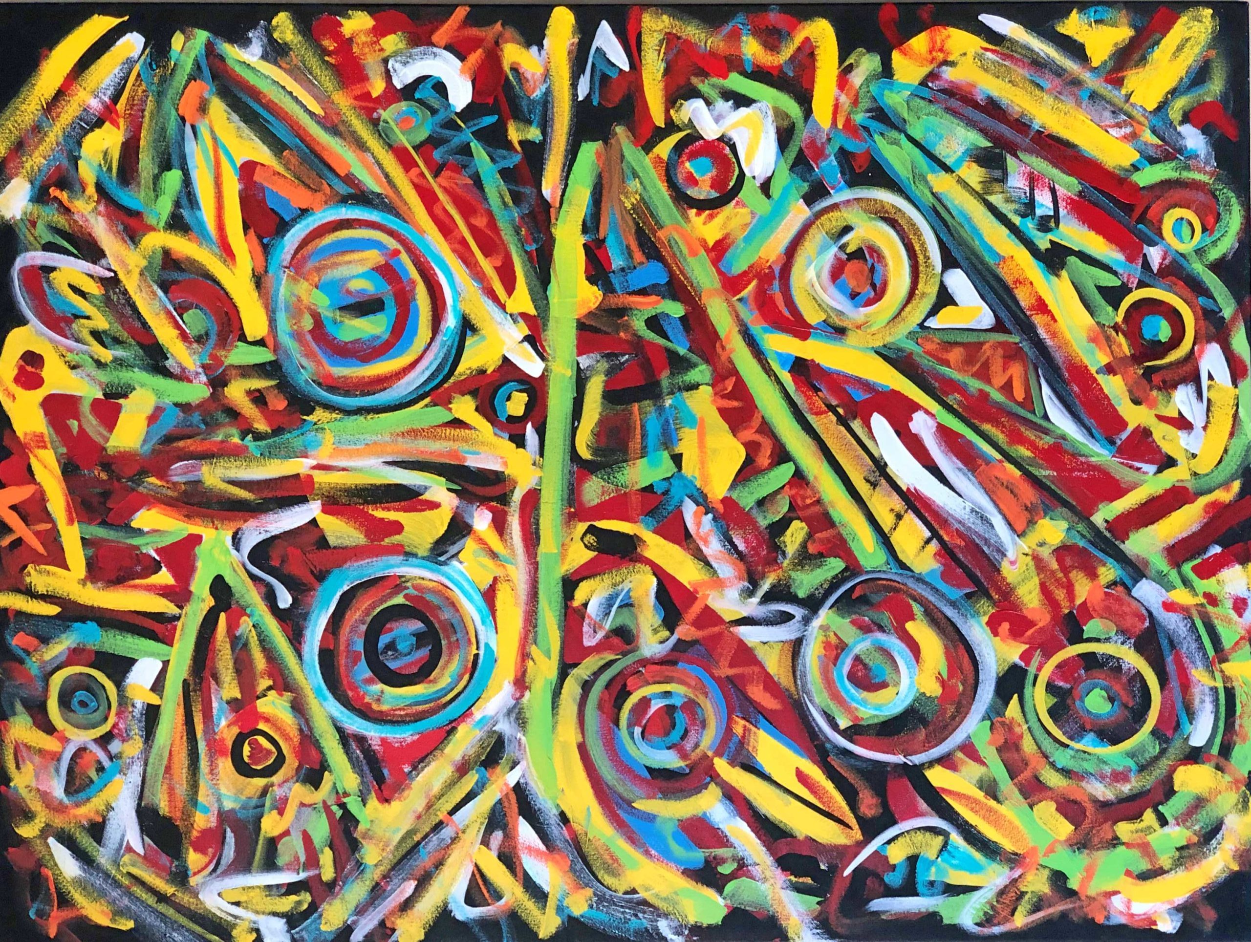 No. 2373. “Celebration Gathering” aka “Murder of Crows” from the Artist’s Primitive Series. $6,500. Original mixed acrylic paint on 48″ x 36″ x 1.5″ stretched canvas. © Dec 2018 John R Kazanjian, San Diego, CA. Artist influences: Joan Miro, Pablo Picasso, San Francis, Karl Appel and Pul Klee. Artist Signature, Year and Piece Number on Back of Canvas. Placement: Canvas may be rotated for flexibility in display and for viewers’ additional experiences.