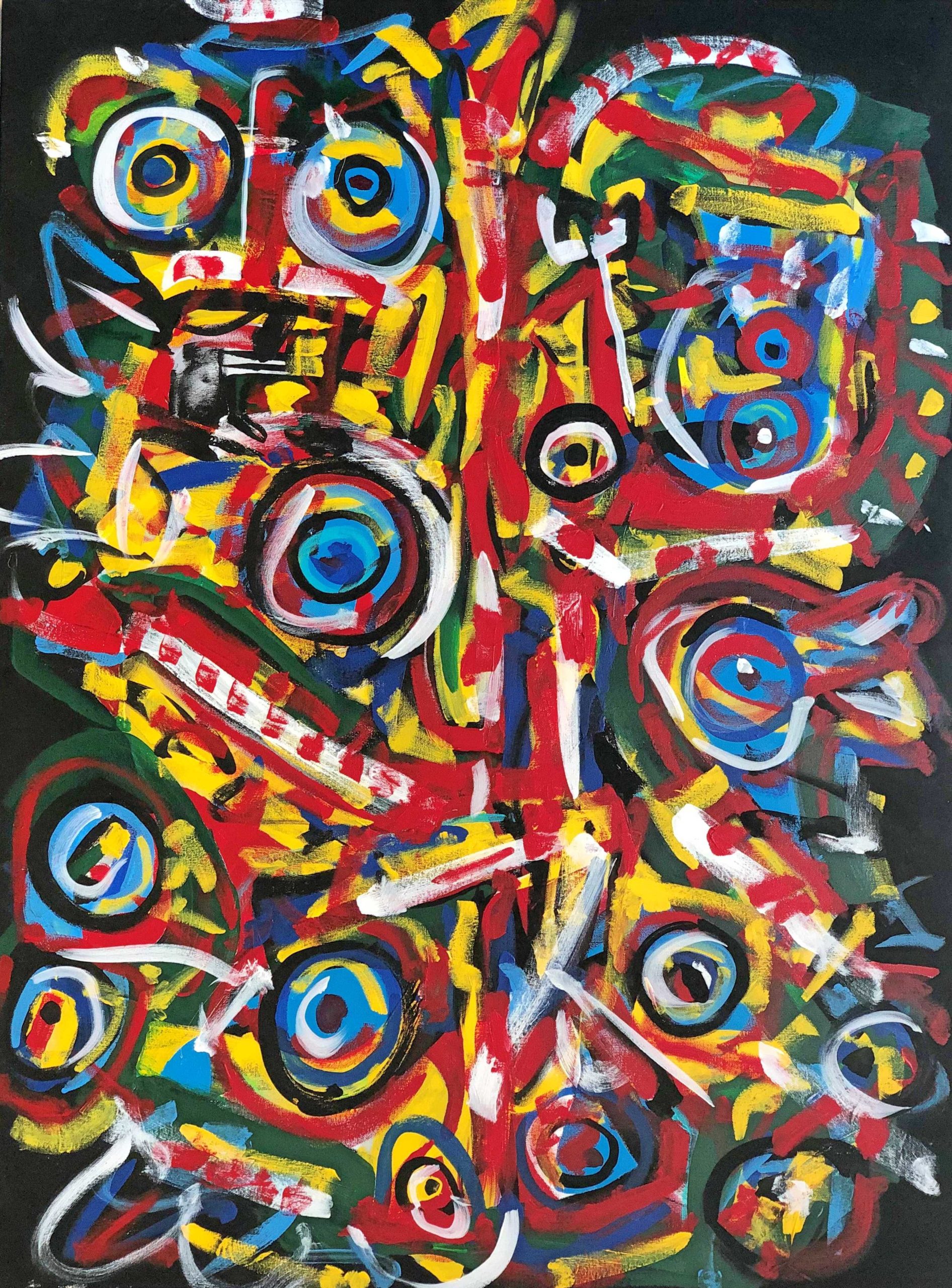 No. 2374. “Menagerie Totem” from the Artist’s Primitive Series. $6,500. Original mixed acrylic paint on 48″ x 36″ x 1.5″ stretched canvas. © Dec 2018 John R Kazanjian, San Diego, CA. Artist influences: Joan Miro, Pablo Picasso, San Francis, Karl Appel and Pul Klee. Artist Signature, Year and Piece Number on Back of Canvas. Placement: Canvas may be rotated for flexibility in display and for viewers’ additional experiences.