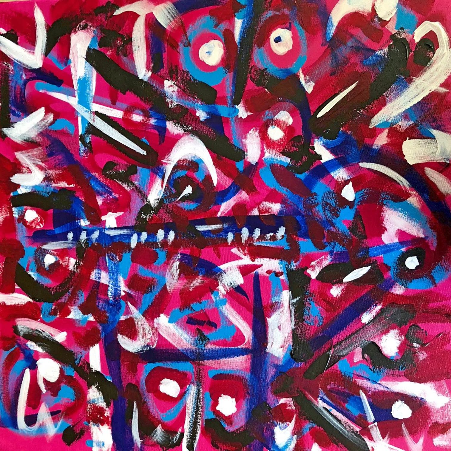 No. 2381. “Raspberry Ecstasy” from the Primitive Series. $2,250. Original mixed acrylic paint on 24″ x 24″ x 1.5″ stretched canvas. © 2019 John R Kazanjian, San Diego, CA. Artist influences: Karel Appel, Joan Miro, Paul Klee, Kandinsky. Placement: Canvas may be rotated for flexibility in display and for viewers’ additional experiences. Artist Signature, Year and Piece Number on Back of Canvas.