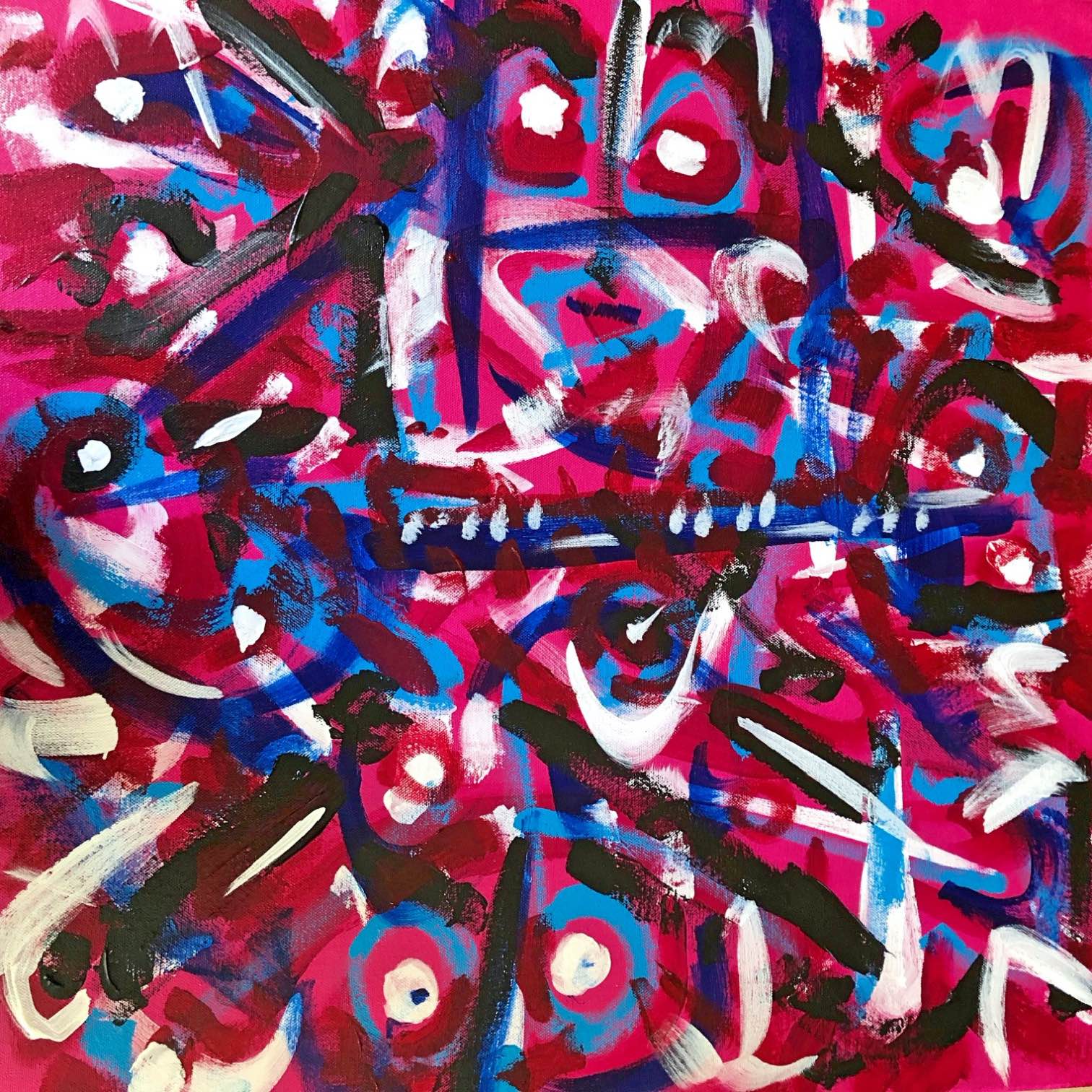 No. 2381. “Raspberry Ecstasy” from the Primitive Series. $2,250. Original mixed acrylic paint on 24″ x 24″ x 1.5″ stretched canvas. © 2019 John R Kazanjian, San Diego, CA. Artist influences: Karel Appel, Joan Miro, Paul Klee, Kandinsky. Placement: Canvas may be rotated for flexibility in display and for viewers’ additional experiences. Artist Signature, Year and Piece Number on Back of Canvas.