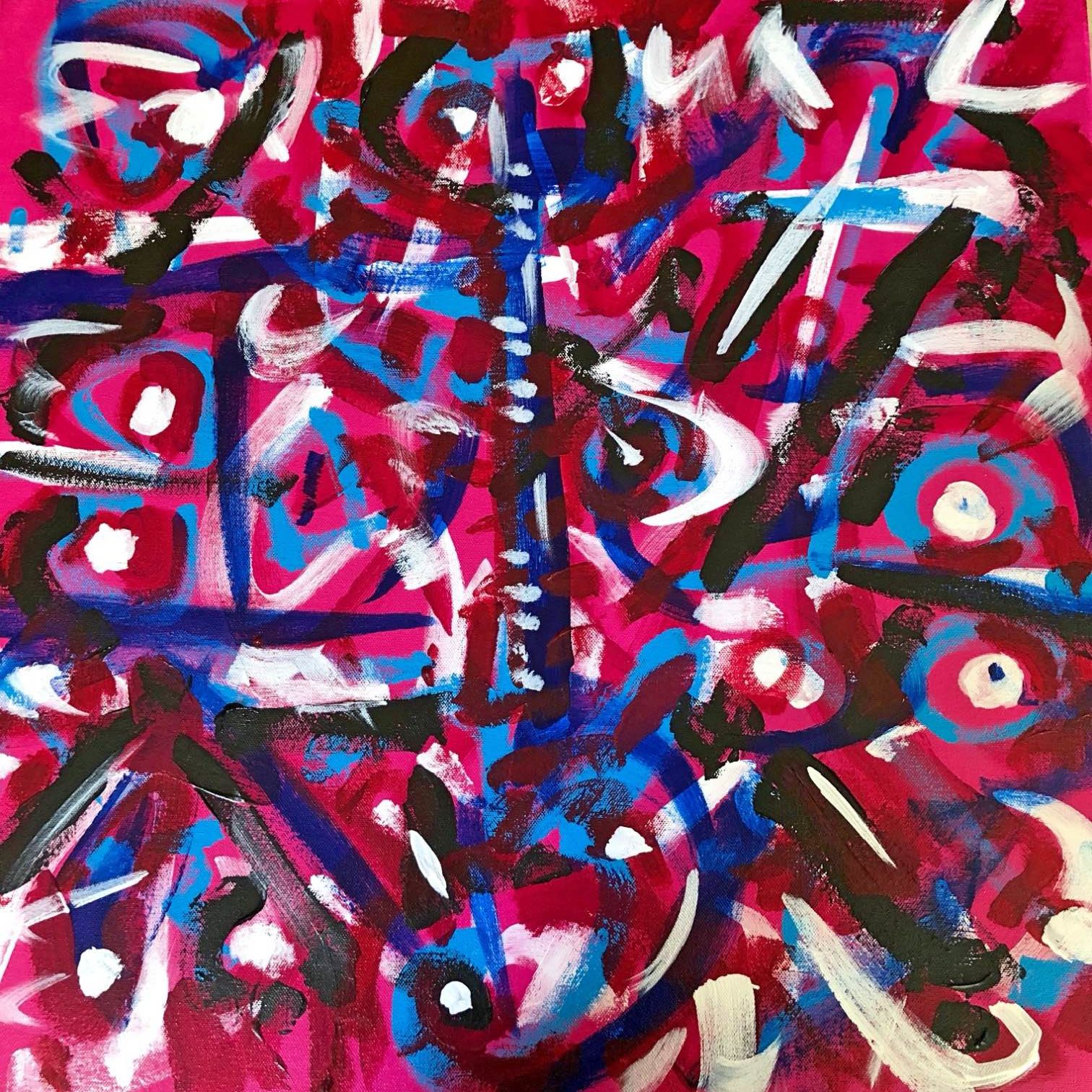 No. 2381. “Raspberry Ecstasy” from the Primitive Series. $2,250. Original mixed acrylic paint on 24″ x 24″ x 1.5″ stretched canvas. © 2019 John R Kazanjian, San Diego, CA. Artist influences: Karel Appel, Joan Miro, Paul Klee, Kandinsky. Placement: Canvas may be rotated for flexibility in display and for viewers’ additional experiences. Artist Signature, Year and Piece Number on Back of Canvas.