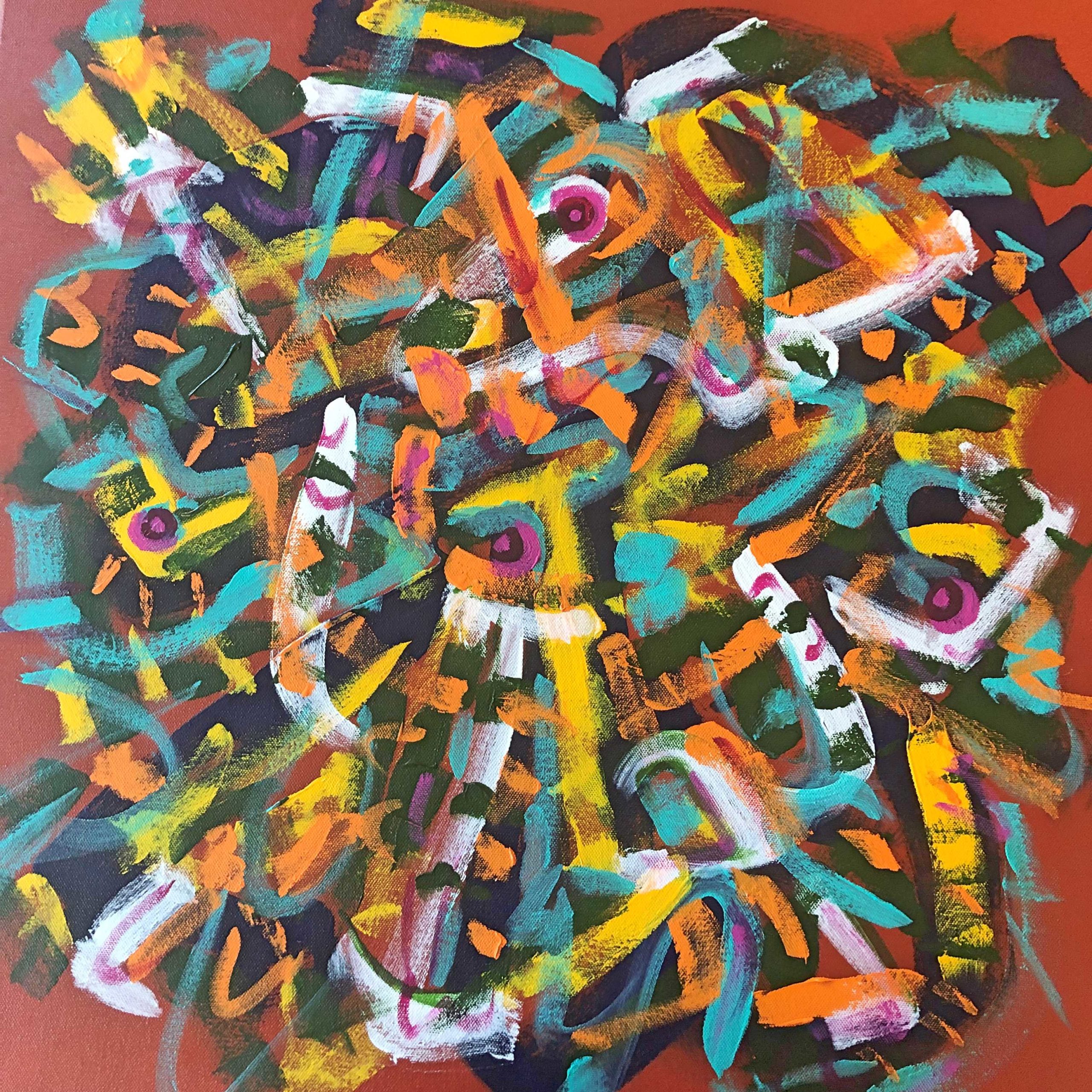 No. 2382. “Zuni Head Dress” from the Primitive Series. $2,250. Original mixed acrylic paint on 24″ x 24″ x 1.5″ stretched canvas. © 2019 John R Kazanjian, San Diego, CA. Artist influences: Karel Appel, Joan Miro, Paul Klee, Kandinsky. Placement: Canvas may be rotated for flexibility in display and for viewers’ additional experiences. Artist Signature, Year and Piece Number on Back of Canvas.