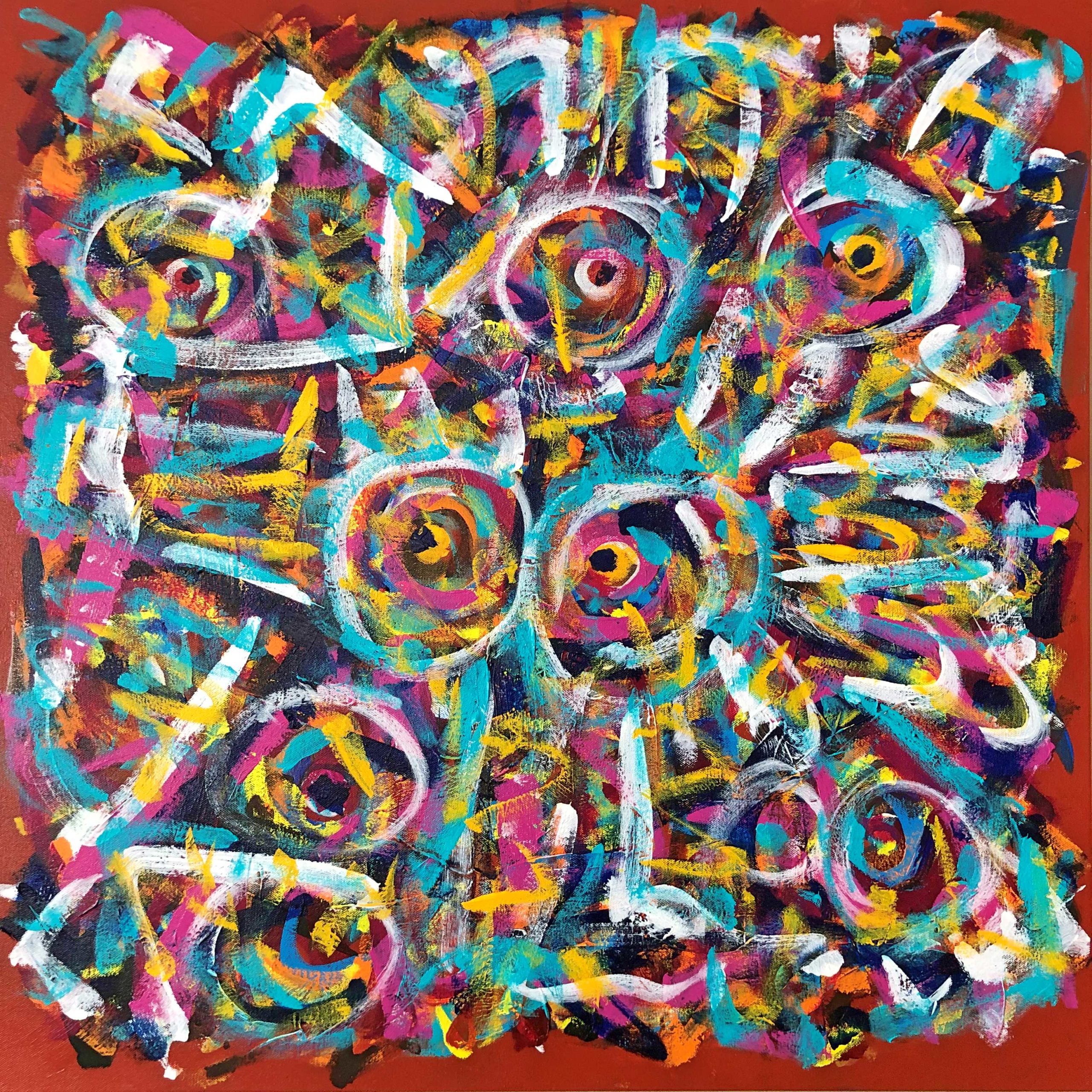 No. 2389. “Souls Lost to Cancer” from Artist’s Tribute Series. $2,250. Original Mixed Acrylic on 30″ x 30″ x 1.5″ Premium Quality Stretched Canvas. © John R Kazanjian, San Diego, CA 2019. Artist influences: Karel Appel, Joan Miro, Paul Klee, Wassily Kandinsky. Artist Signature, Year and Piece Number on Back of Canvas. Placement: Canvas may be rotated for flexibility in display and for viewers’ additional experiences.
