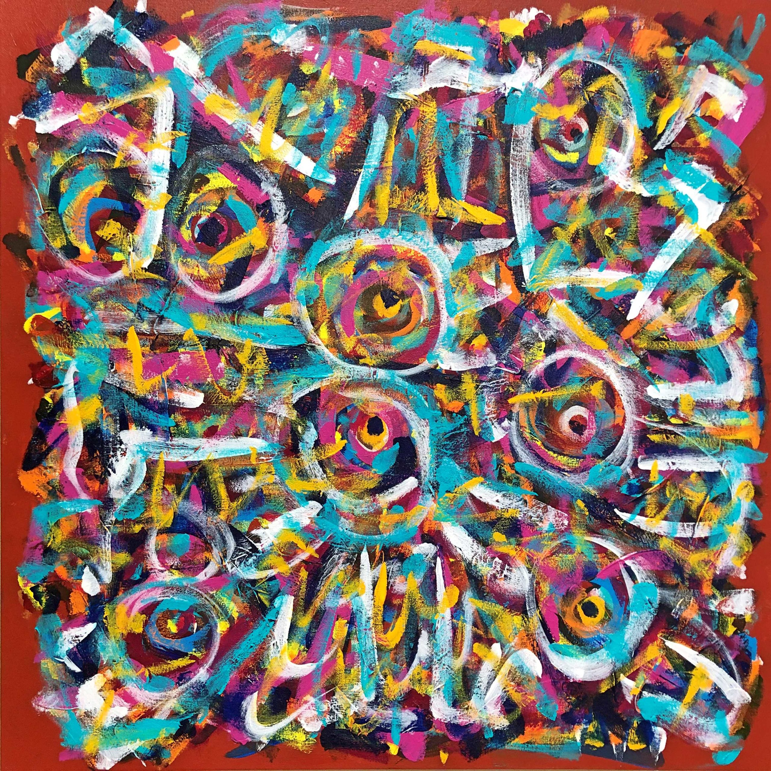 No. 2389. “Souls Lost to Cancer” from Artist’s Tribute Series. $2,250. Original Mixed Acrylic on 30″ x 30″ x 1.5″ Premium Quality Stretched Canvas. © John R Kazanjian, San Diego, CA 2019. Artist influences: Karel Appel, Joan Miro, Paul Klee, Wassily Kandinsky. Artist Signature, Year and Piece Number on Back of Canvas. Placement: Canvas may be rotated for flexibility in display and for viewers’ additional experiences.