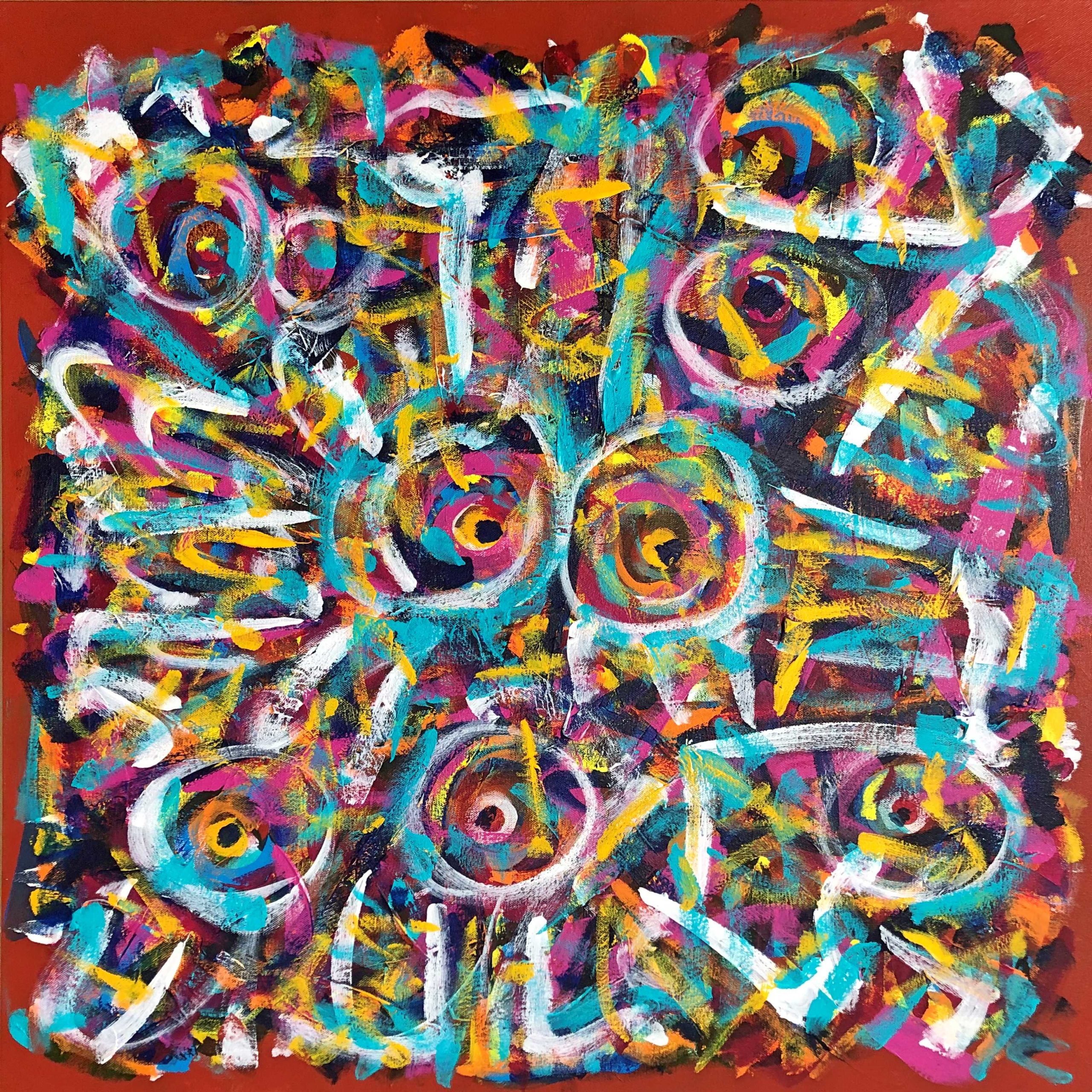 No. 2389. “Souls Lost to Cancer” from Artist’s Tribute Series. $2,250. Original Mixed Acrylic on 30″ x 30″ x 1.5″ Premium Quality Stretched Canvas. © John R Kazanjian, San Diego, CA 2019. Artist influences: Karel Appel, Joan Miro, Paul Klee, Wassily Kandinsky. Artist Signature, Year and Piece Number on Back of Canvas. Placement: Canvas may be rotated for flexibility in display and for viewers’ additional experiences.