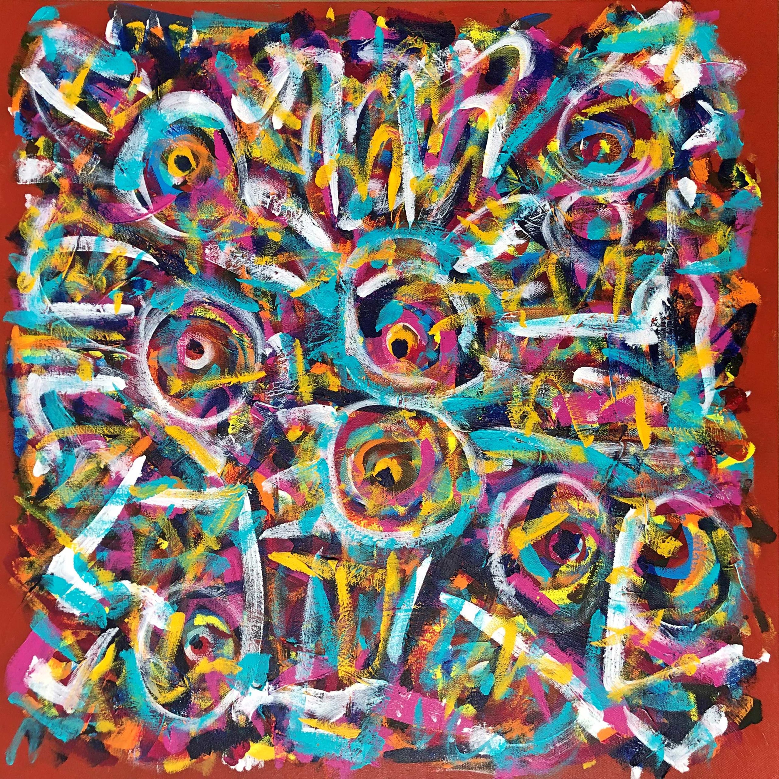 No. 2389. “Souls Lost to Cancer” from Artist’s Tribute Series. $2,250. Original Mixed Acrylic on 30″ x 30″ x 1.5″ Premium Quality Stretched Canvas. © John R Kazanjian, San Diego, CA 2019. Artist influences: Karel Appel, Joan Miro, Paul Klee, Wassily Kandinsky. Artist Signature, Year and Piece Number on Back of Canvas. Placement: Canvas may be rotated for flexibility in display and for viewers’ additional experiences.