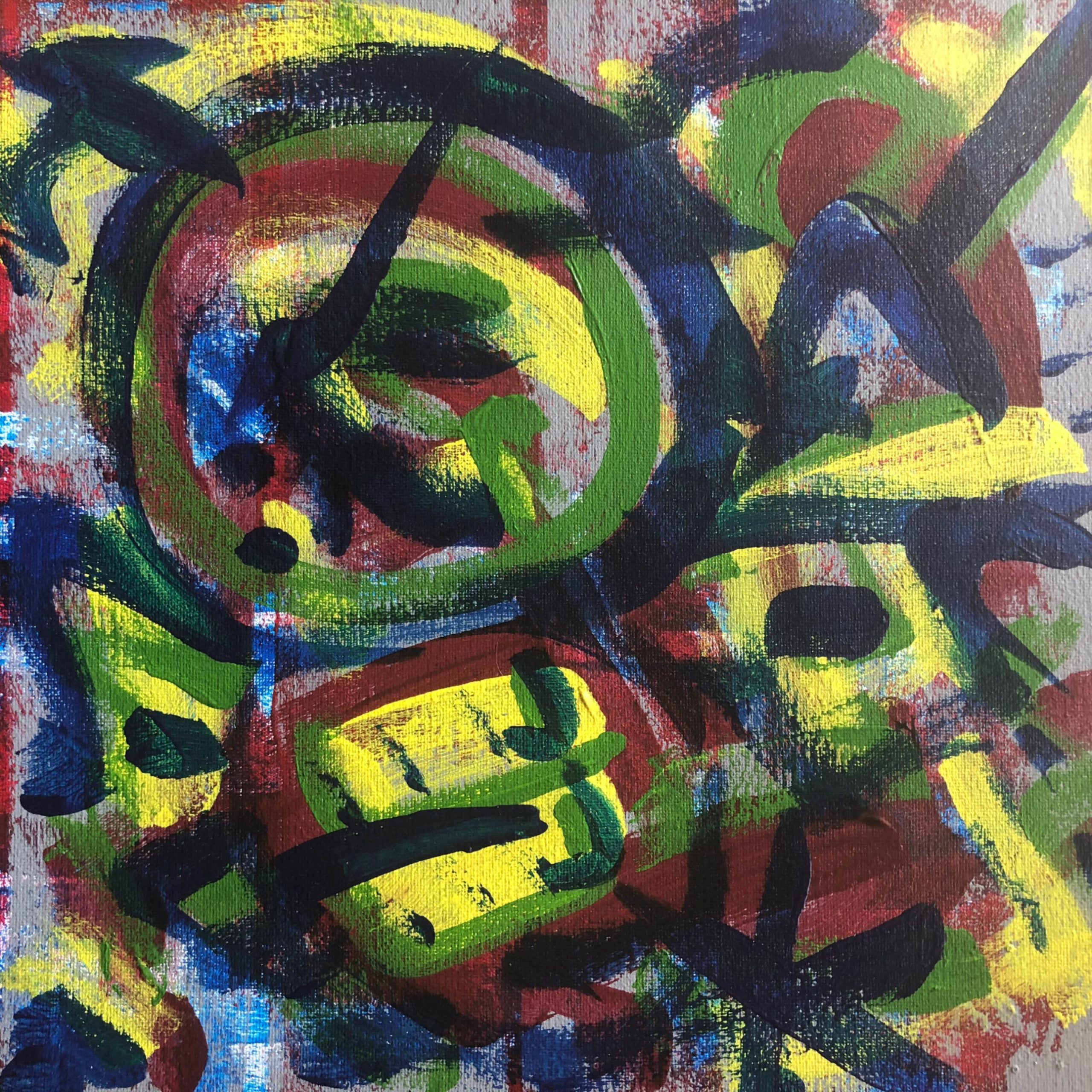 No. 2393. “Miro / Klee Doodles 1″ from the Tribute Series. $250. Original mixed acrylic paint on 12″ x 12″ x .5” stretched canvas. © 2019 John R Kazanjian, San Diego, CA. Artist influences: Paul Klee, Joan Miro, Bauhaus Arts. Artist signature, Year and Piece Number on back of canvas. Placement: canvas may be rotated for flexibility in display and for viewers’ additional experiences.