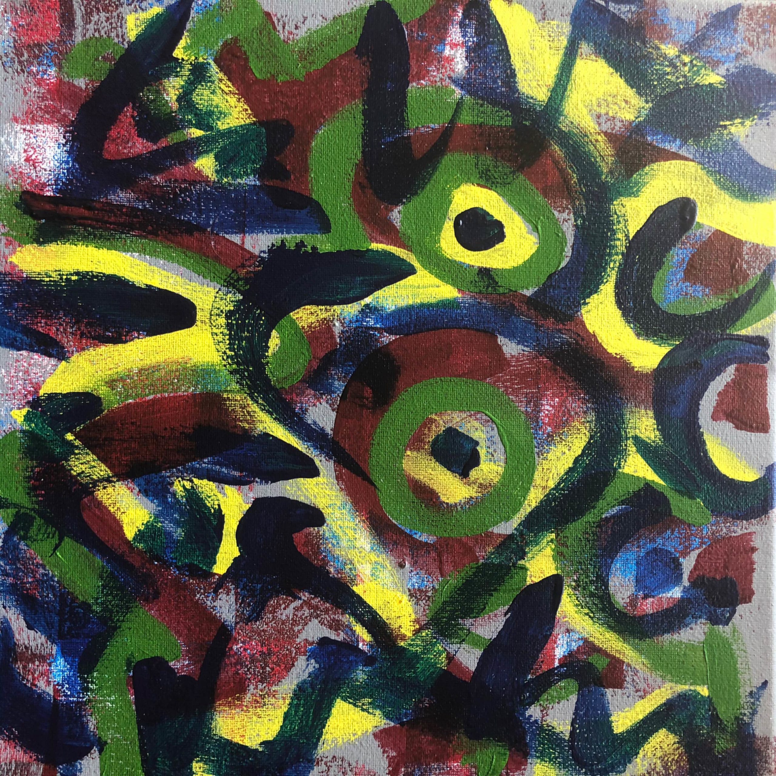 No. 2394. “Miro / Klee Doodles 2″ from the Tribute Series. SOLD Original mixed acrylic paint on 12″ x 12″ x .5” stretched canvas. © 2019 John R Kazanjian, San Diego, CA. Artist influences: Paul Klee, Joan Miro, Bauhaus Arts. Artist signature, Year and Piece Number on back of canvas. Placement: canvas may be rotated for flexibility in display and for viewers’ additional experiences.