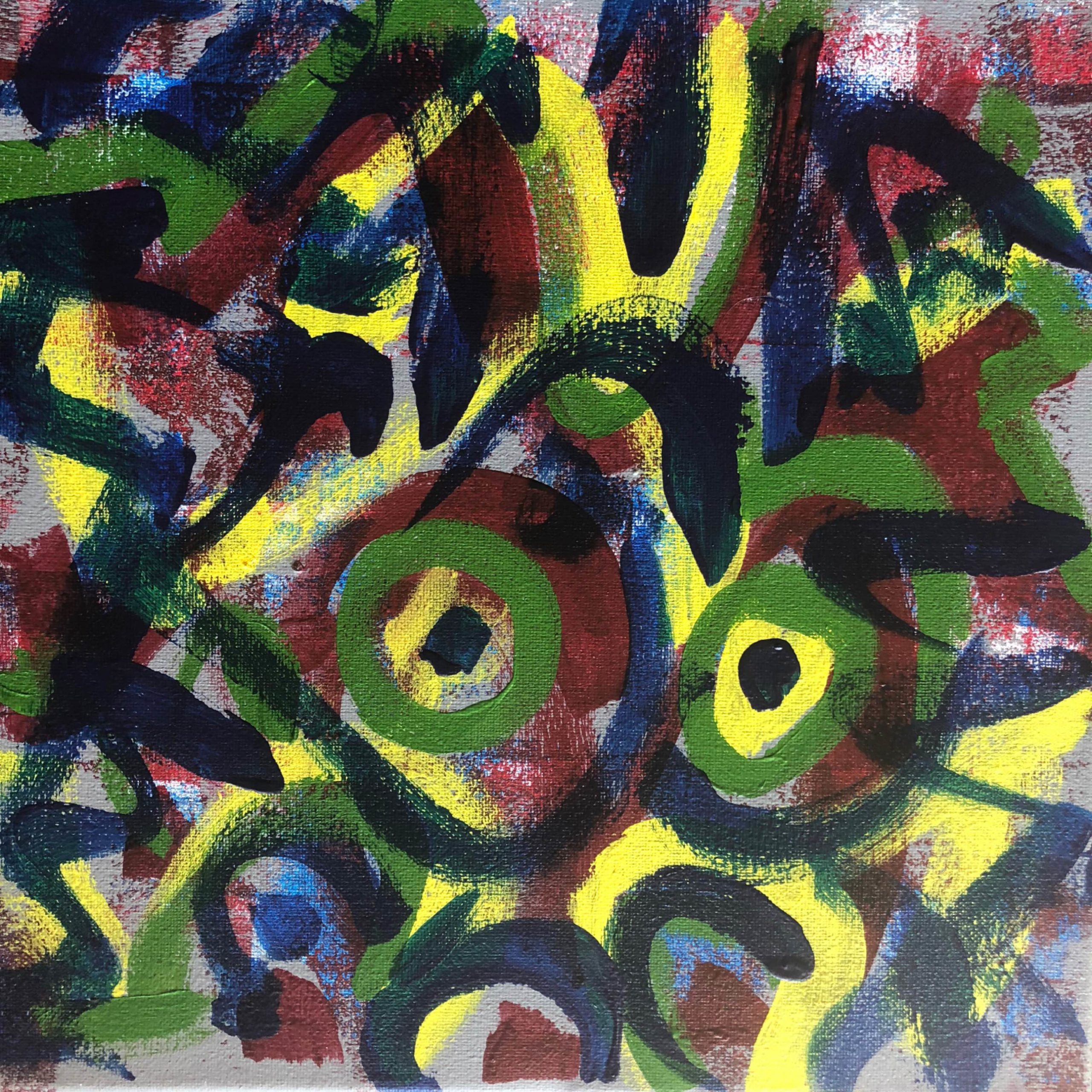 No. 2394. “Miro / Klee Doodles 2″ from the Tribute Series. $250. Original mixed acrylic paint on 12″ x 12″ x .5” stretched canvas. © 2019 John R Kazanjian, San Diego, CA. Artist influences: Paul Klee, Joan Miro, Bauhaus Arts. Artist signature, Year and Piece Number on back of canvas. Placement: canvas may be rotated for flexibility in display and for viewers’ additional experiences.