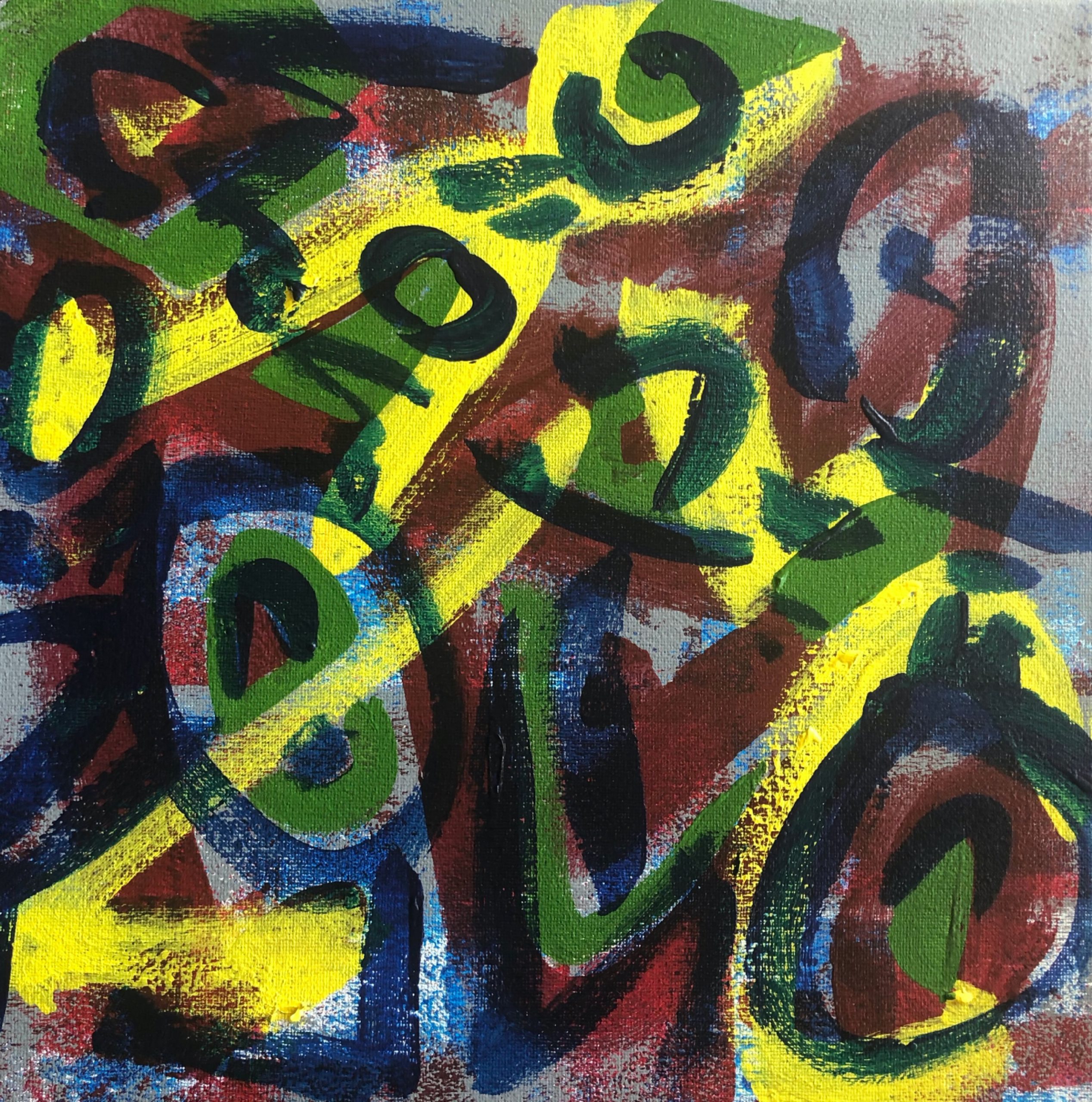 No. 2399. “Miro / Klee Doodles 7″ from the Tribute Series. $250. Original mixed acrylic paint on 12″ x 12″ x .5” stretched canvas. © 2019 John R Kazanjian, San Diego, CA. Artist influences: Paul Klee and Joan Miro. Canvas may be rotated for flexibility in display and for viewers’ additional experiences. Artist Signature, Year and Piece Number on Back of Canvas.