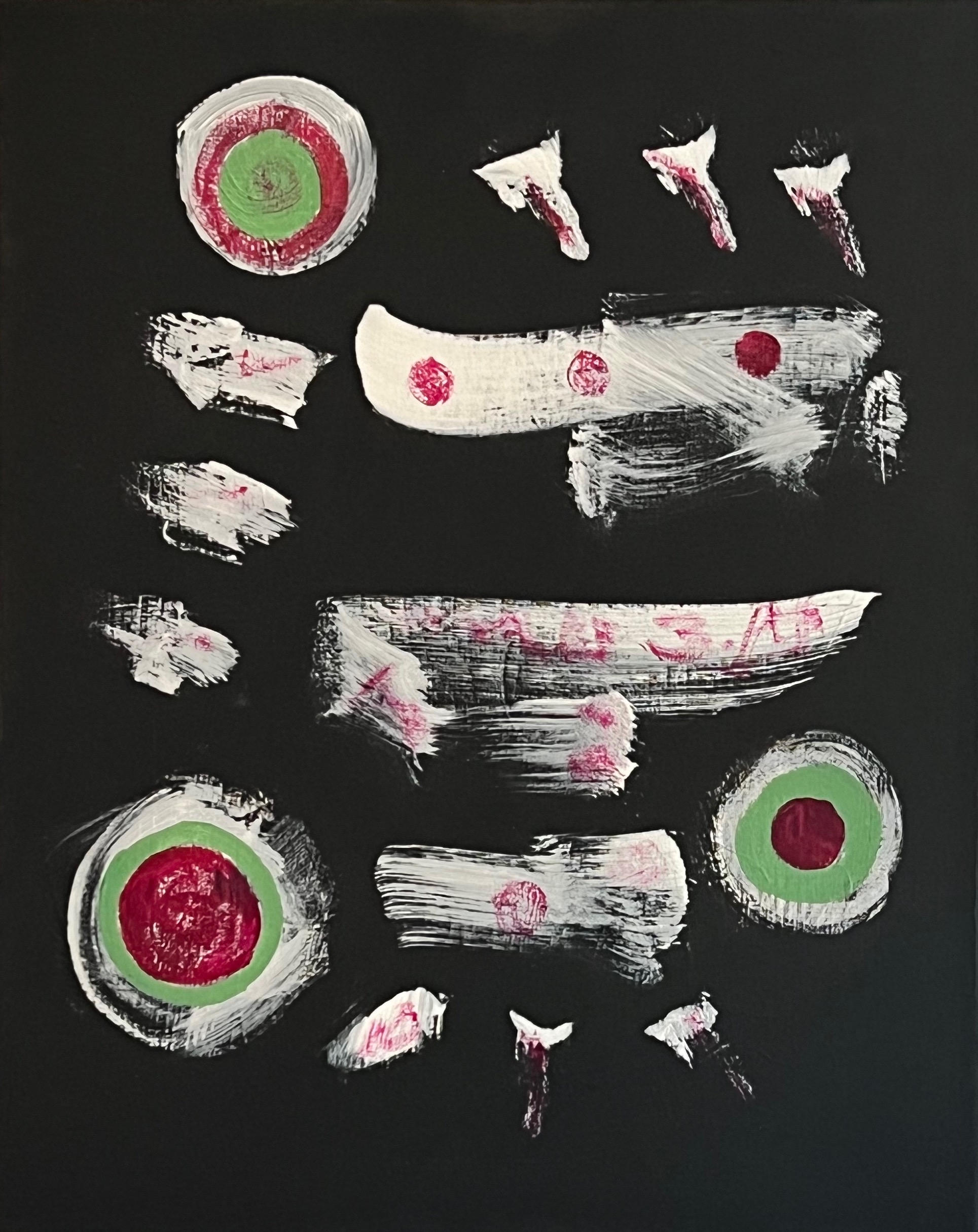 Original mixed acrylic paint on 20″h x 16″w x 0.5″ stretched canvas. Artist number, signature and date en verso. May be viewed from each of 4 sides for view enjoyment. San Diego 2022.