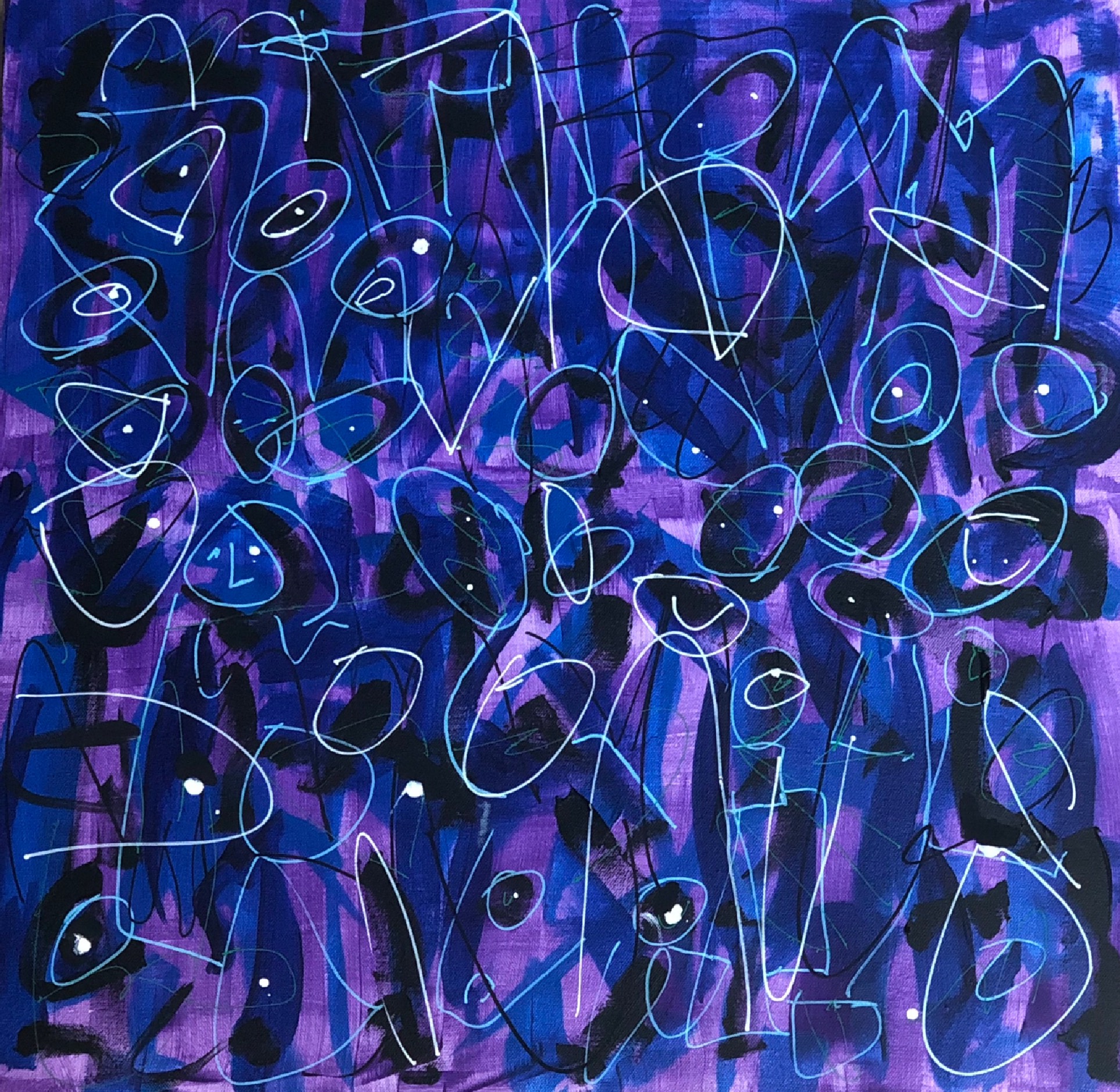 No. 2386. “Sentient Blues” from the Transcending Portals Series. $2,250. Original mixed acrylic paint on 24″ x 24″ x 1.5″ stretched canvas. © 2019 John R Kazanjian, San Diego, CA. Artist influences: Karel Appel, Joan Miro, Paul Klee, Kandinsky. Two predominant views. Artist Signature, Year and Piece Number on Back of Canvas.