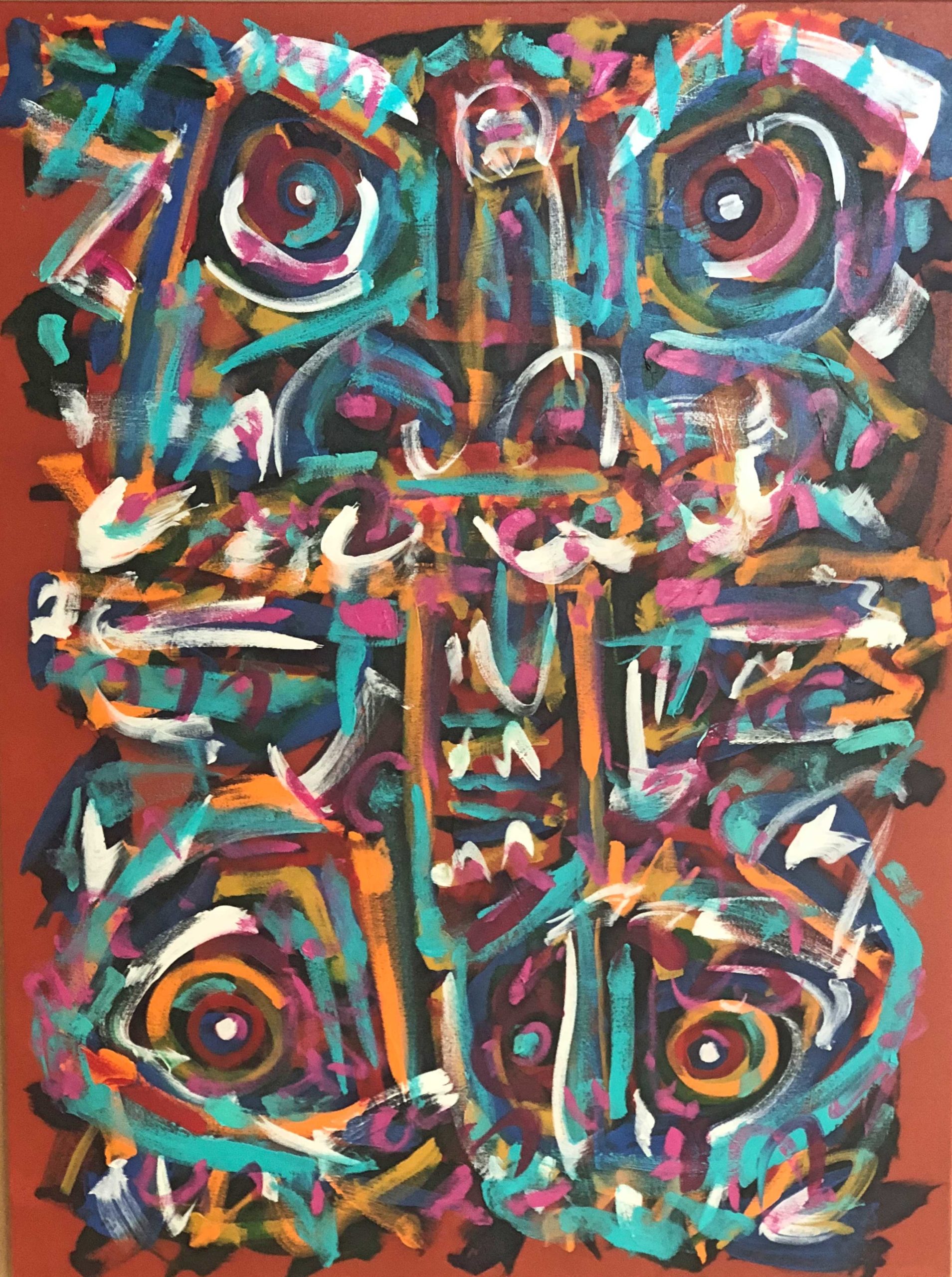 No. 2385. “Primitive Warriors Dancing-2″ from Artist’s Primitive Series. $6,500. Original Mixed Acrylic on 48″ x 36″ x 1.5” Premium Quality Stretched Canvas. © John R Kazanjian, San Diego, CA 2019. Artist influences: Karel Appel, Joan Miro, Paul Klee, Wassily Kandinsky. Artist Signature, Year and Piece Number on Back of Canvas
